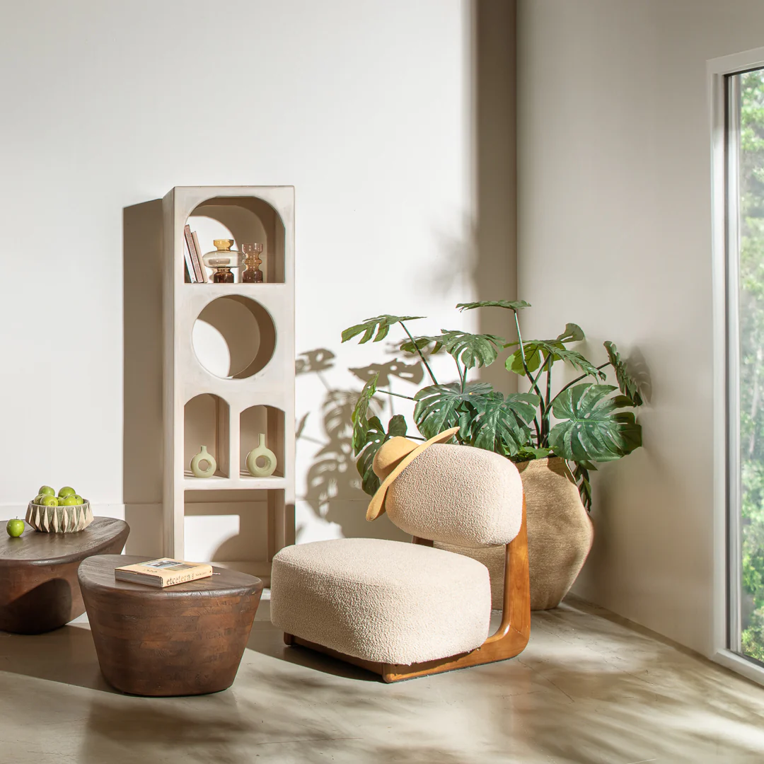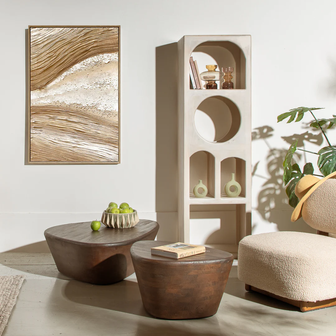 ארון מדפים גבוה גולד קוסט בצבע בז'. רהיט מעוצב גימור עגול בניראות ייחודית.