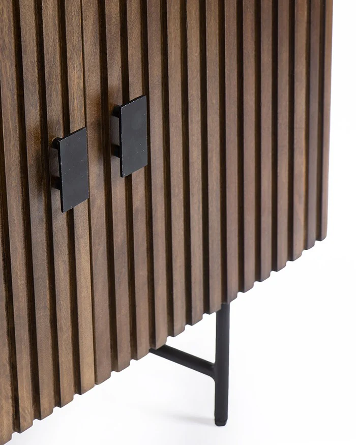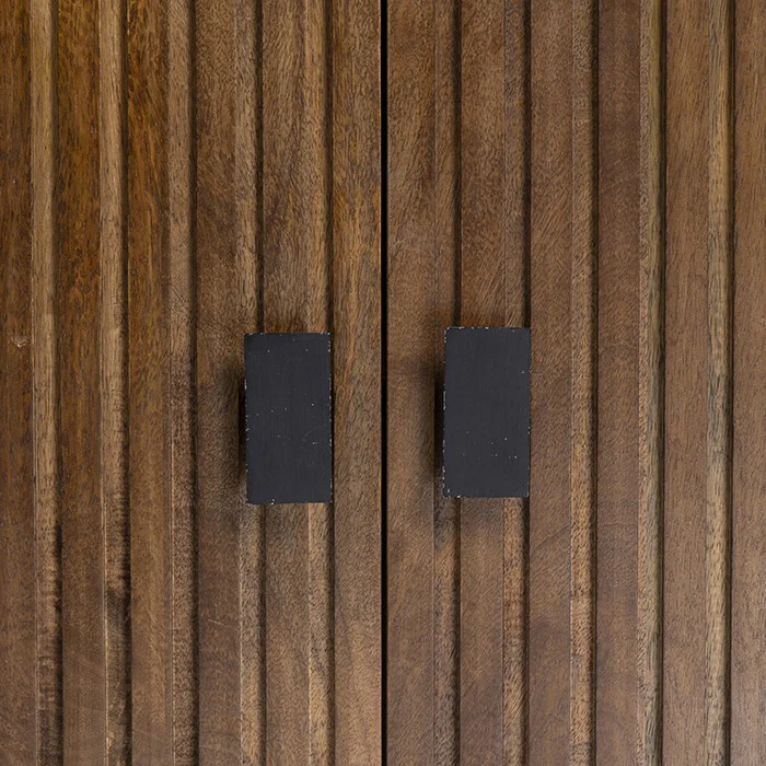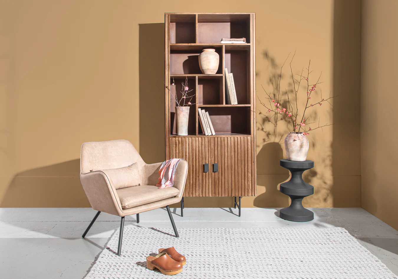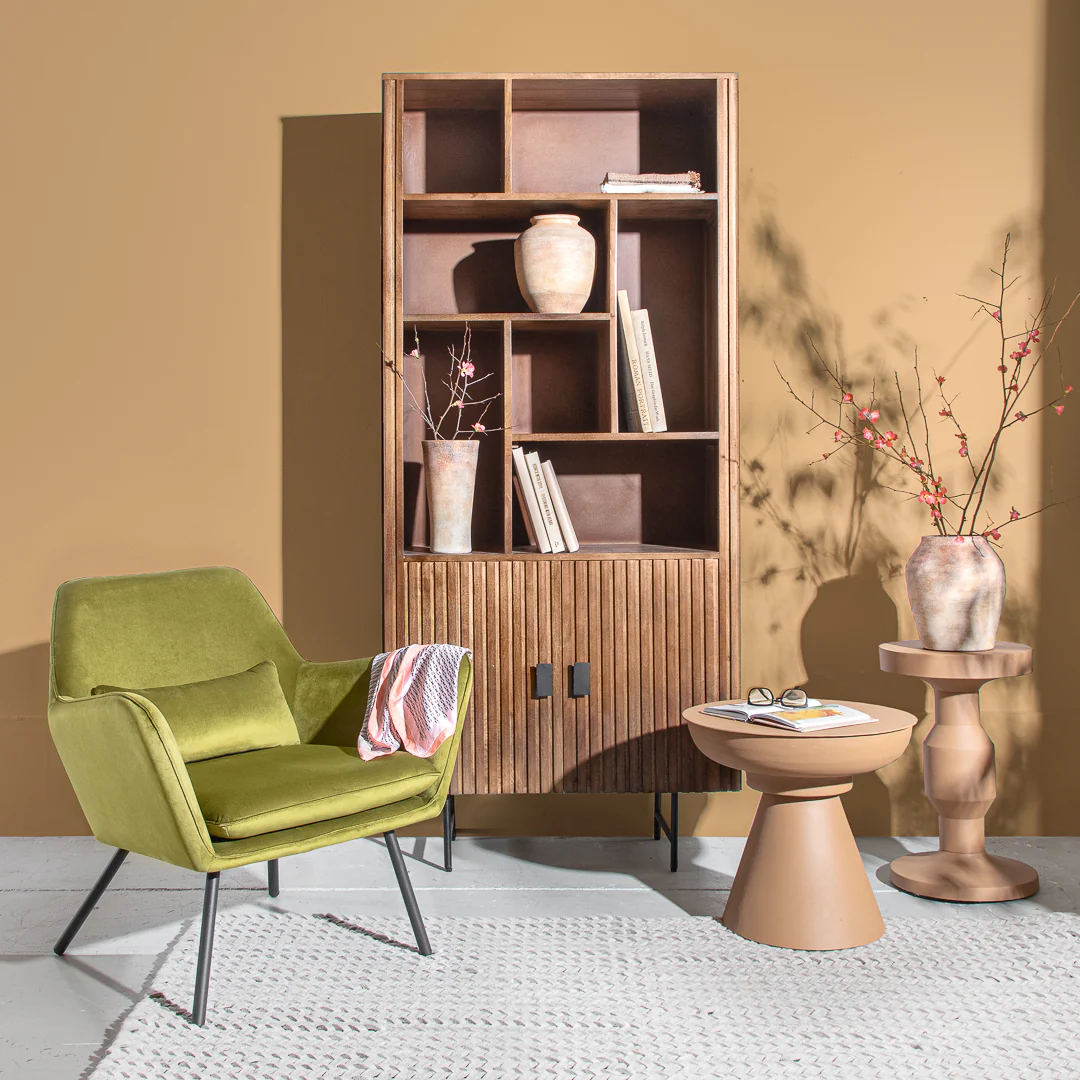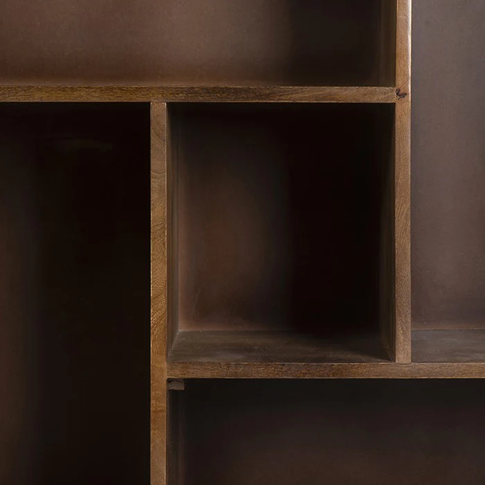 ארון מדפים מלבני גבוה עשוי עץ מנגו במראה אדג'י בגוון חום עמוק. משולב דלתות איחסון ומדפים לפריטי נוי וספרים. הרהיט האולטימטיבי לשדרוג כל חלל
