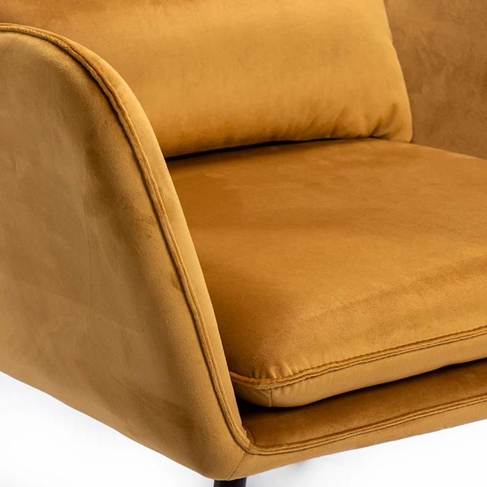 כורסאת שיקגו במרקם קטיפתי בגוון כתום, הניצבת על רגלי מתכת זוויתיות בצבע שחור. כורסא בקו FINE הומרת על רלוונטיות תמידית