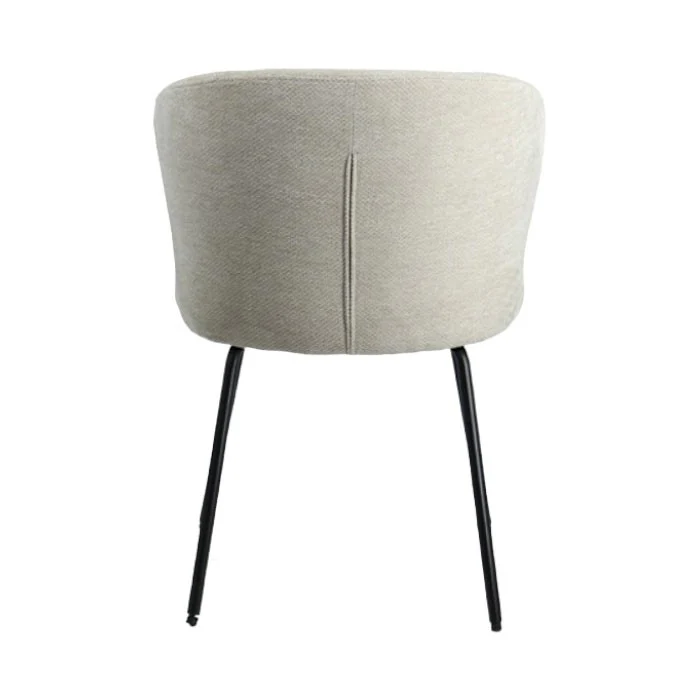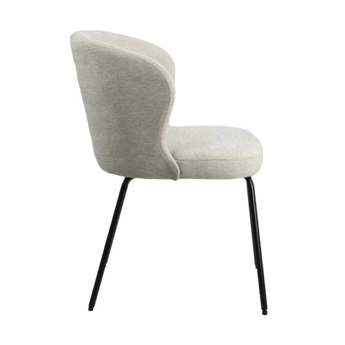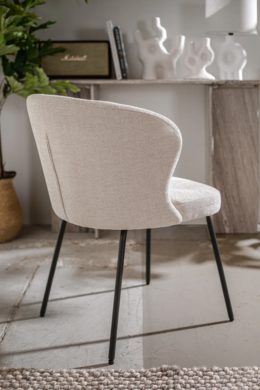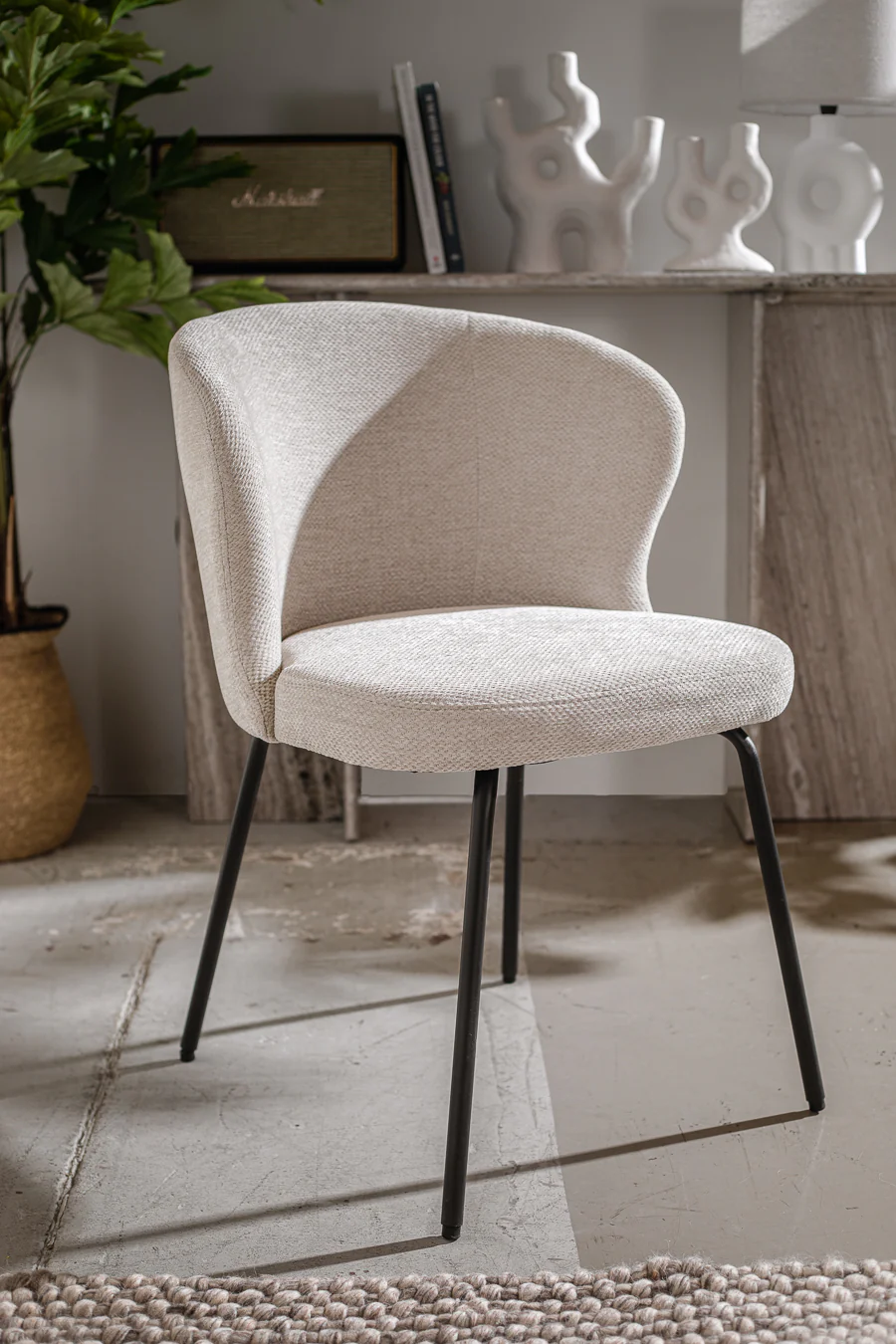 כיסא מקס מעוגל בצבע לבן . כיסא ישיבה המעוצב משענת עוטפת ומושב רך הנישא על רגלי מתכת שחורות. כיסא אירוח מושלם לשילוב סביב שולחן פינת האוכל או בחלל המגורים