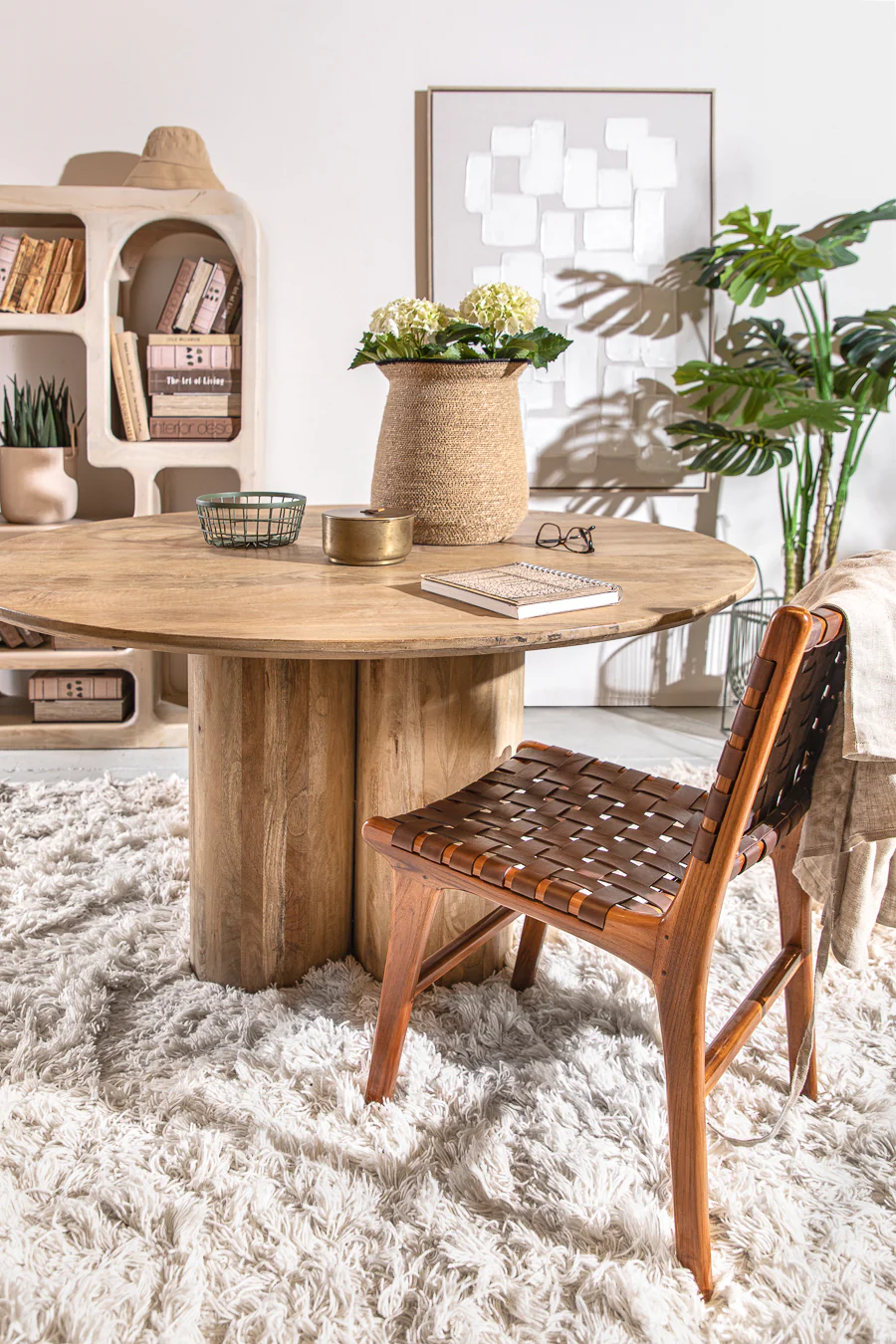 כיסא עור קלוע בגוון חום חם. כיסא טרקלין כובש עשוי עור איכותי הנישא על רגליי עץ טיק. מתאים לאוהבי העיצוב הקלאסי.