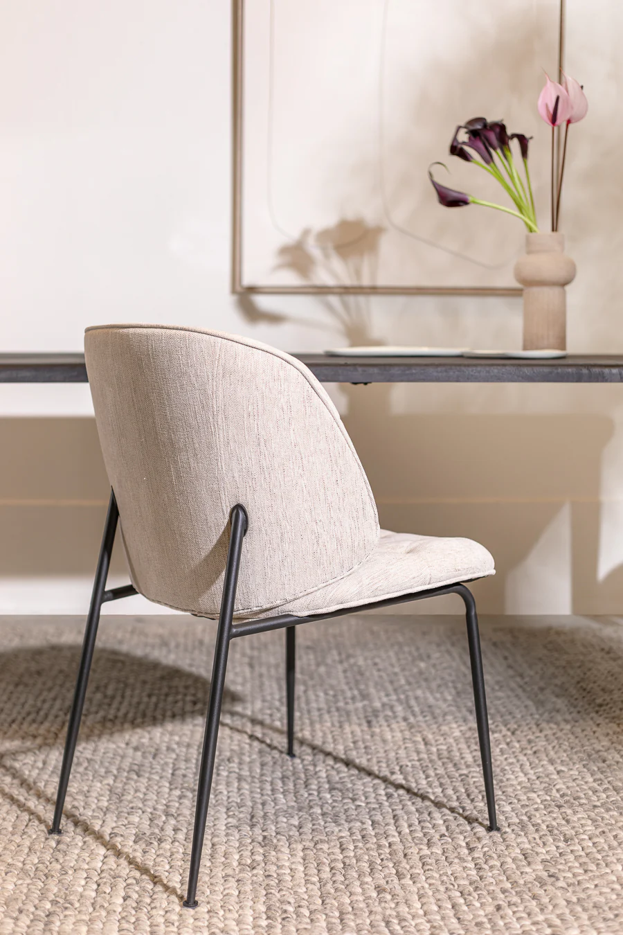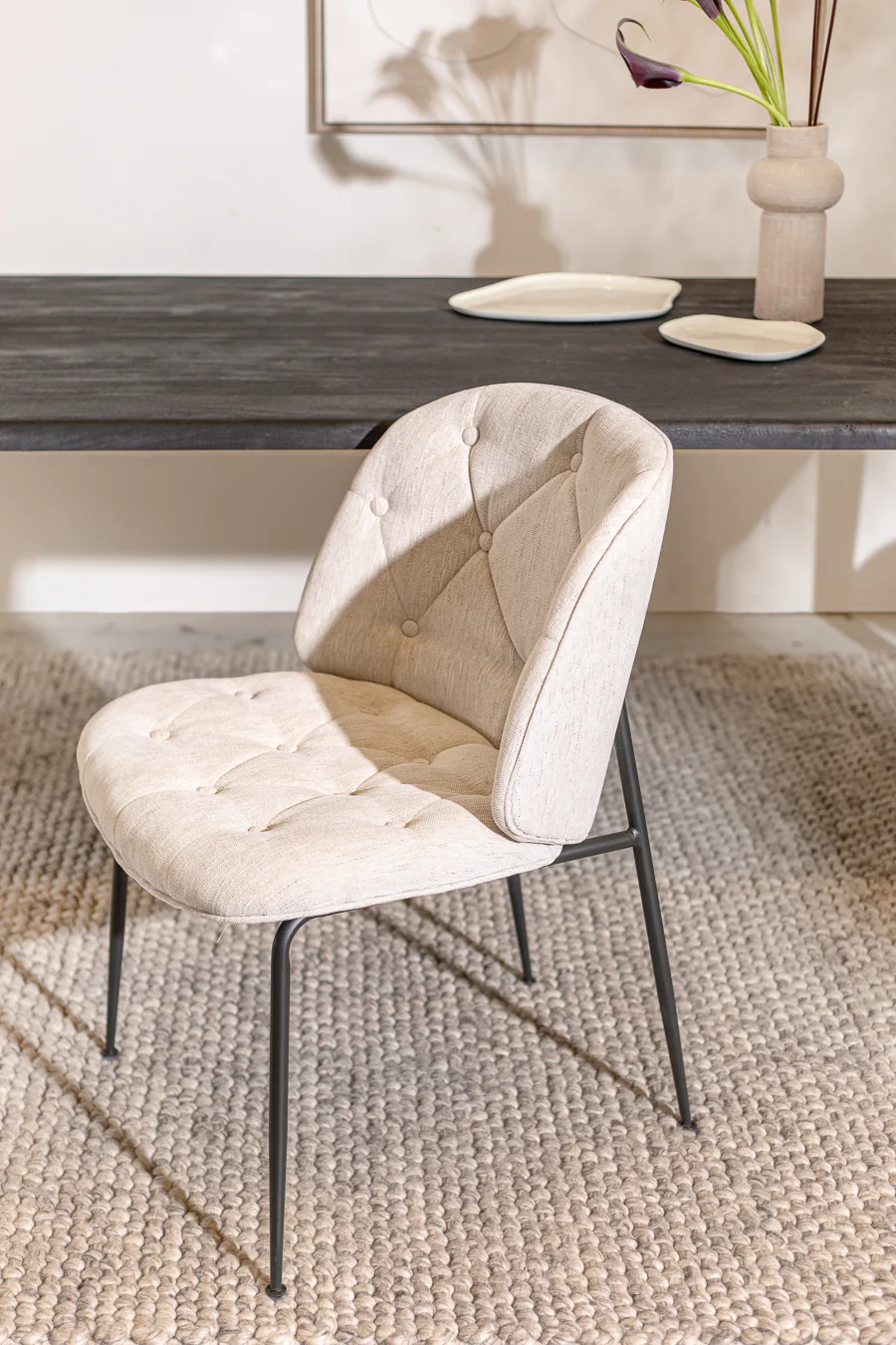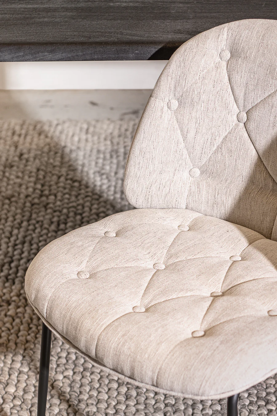 כיסא אירוח סופי בצבע בז' . כיסא מרופד משענת גב ומושב תפירת קפיטונאג' הנישא על רגלי עץ שחורות.