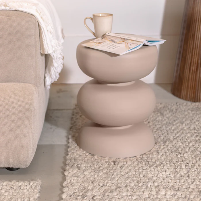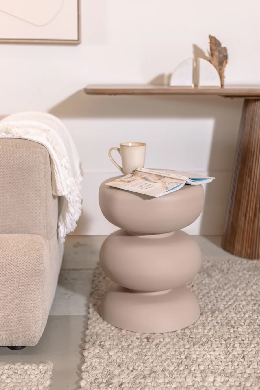 סטול מתכת אייקון רינג פרופיל גלי בגוון בז'. סטול אמורפי מעוצב גליל בעובי טבעות משתנה. סטול פיסולי מושלם כפודיום לעציץ או כשולחן צד.
