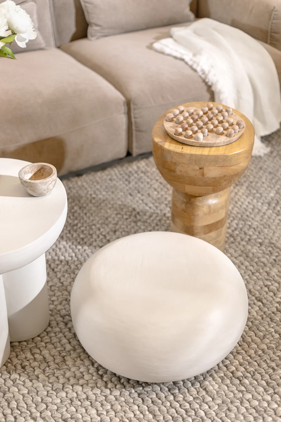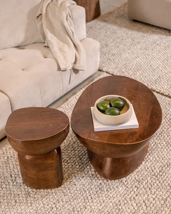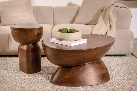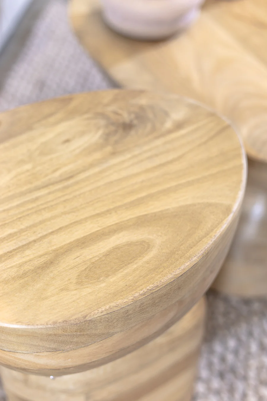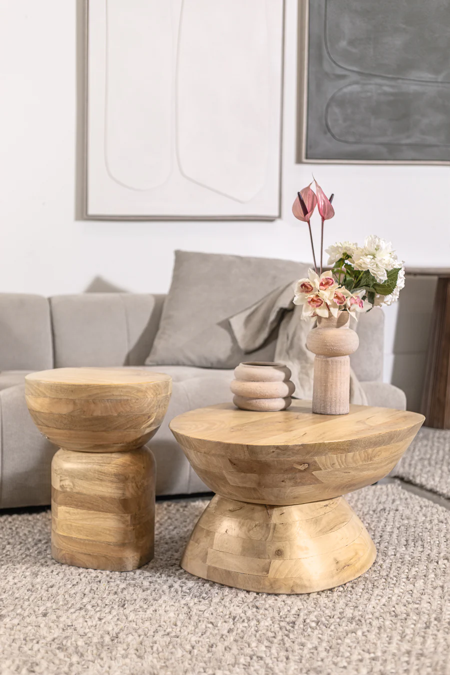 שולחן צד לוסט אורגניק עשוי עץ מנגו בגוון טבעי. סטול יציב המורכב בארל עליון כיפתי הנישא על רגל מלבן גושנית.