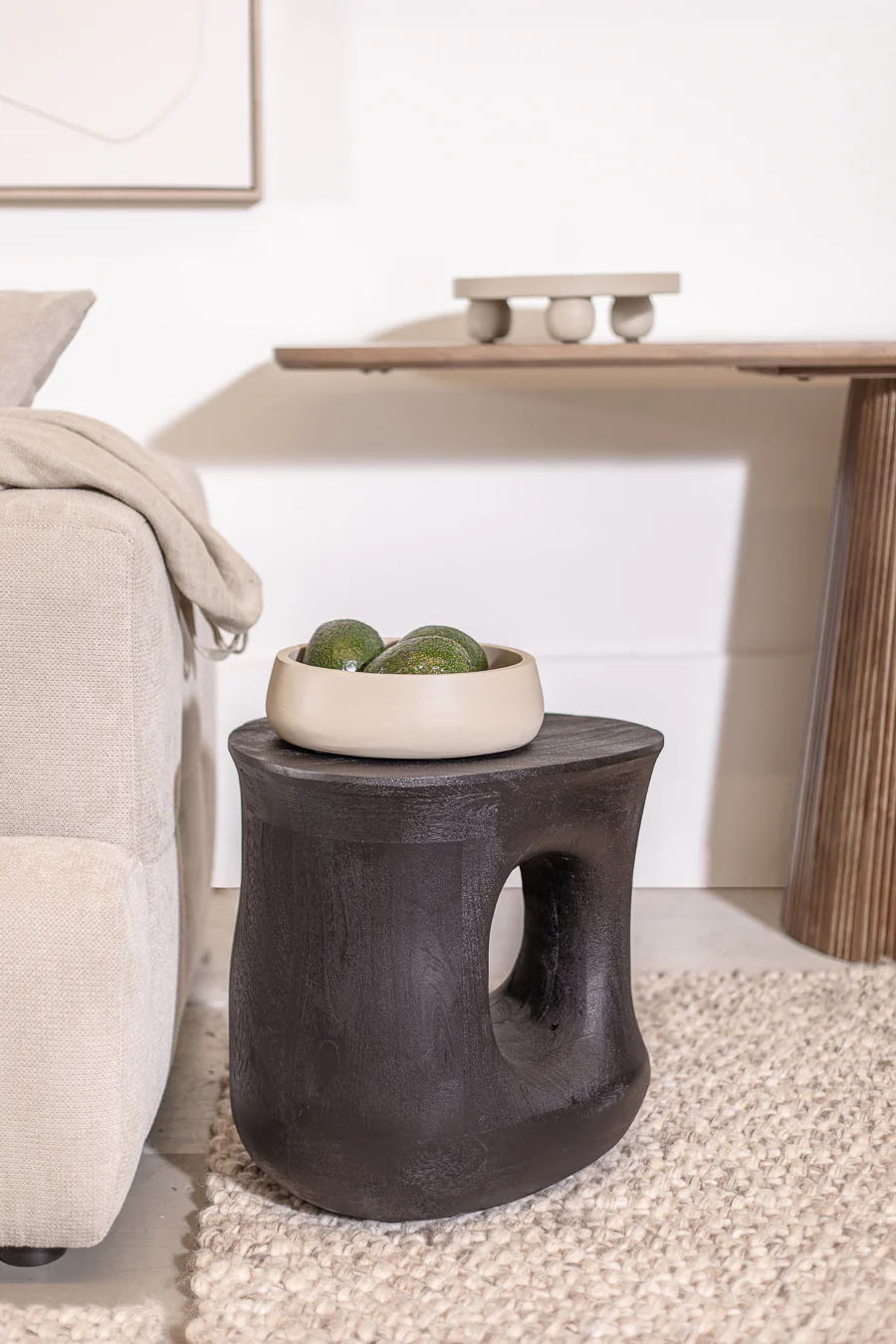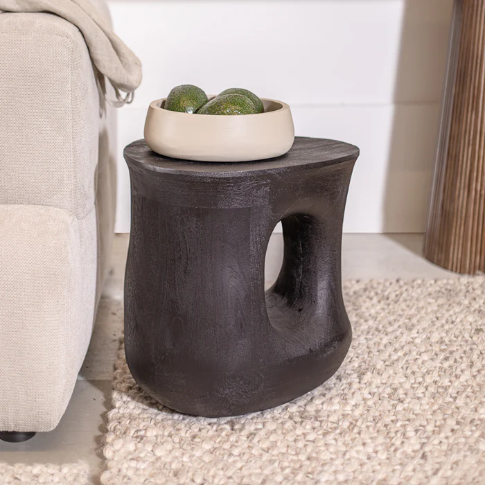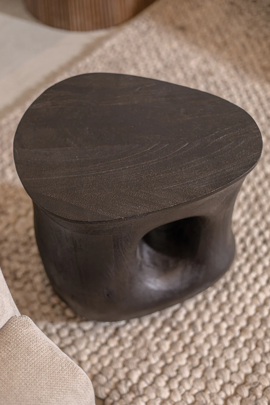 סטול עץ פרימיטיב בצבע שחור. שולחן צד אמורפי המורכב פלטה דקה הנישאת על רגל עץ גושנית אמורפית. סטול שהוא PIECE עם אמירה עיצובית