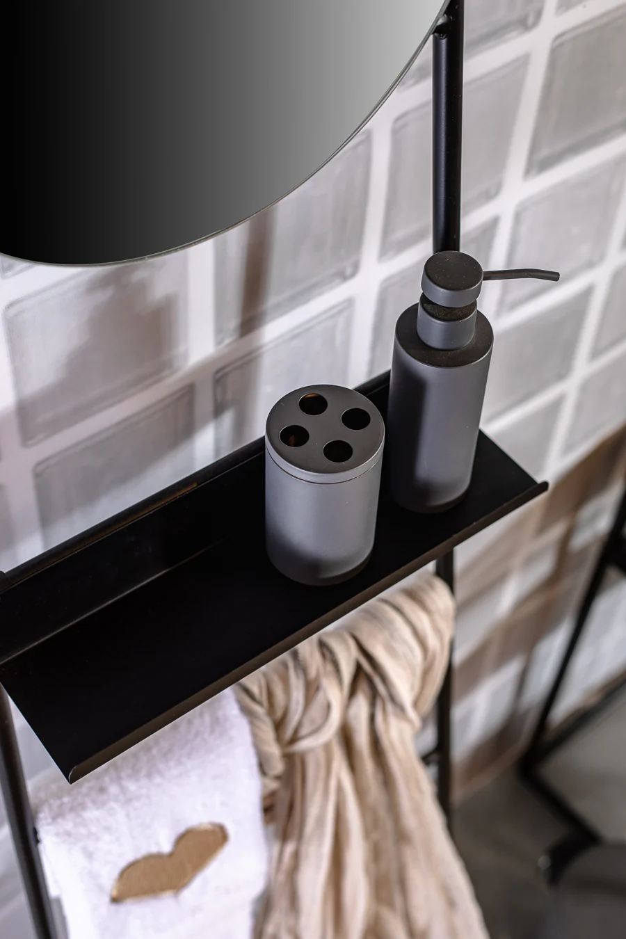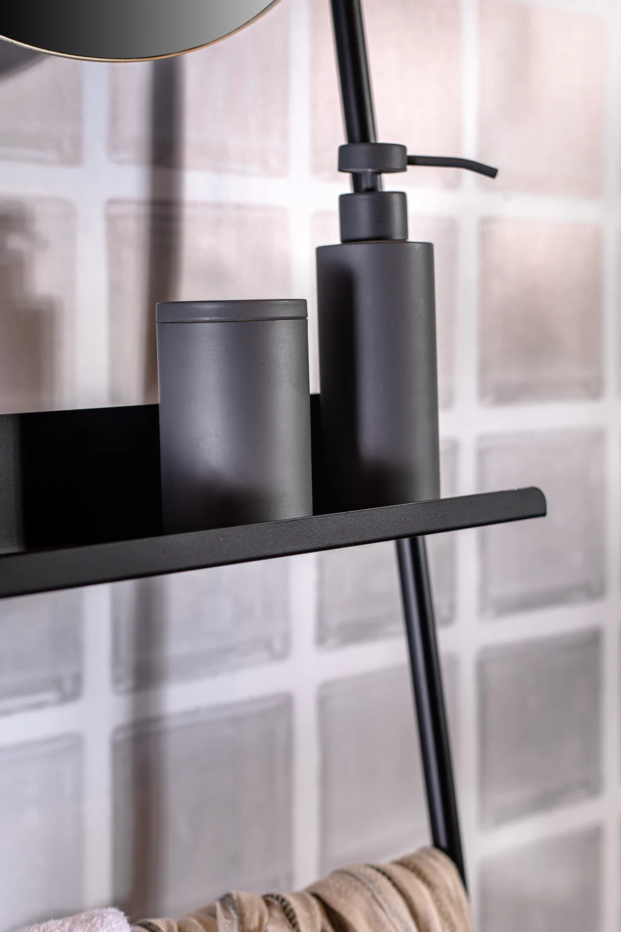סט אמבטיה ארנסטו סילואט עגול בצבע שחור. סט איבזור 3 חלקים: מיכל דיספנסר סבון נוזלי, כוס מברשות שיניים, וסבוניה בעיצוב תעשייתי מודרני.