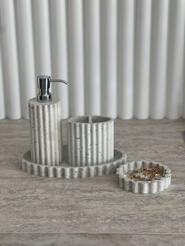 מגש אליפסה, כוס למברשות, דספנסר וצלוחית קטנה לתכשיטים או סבון.