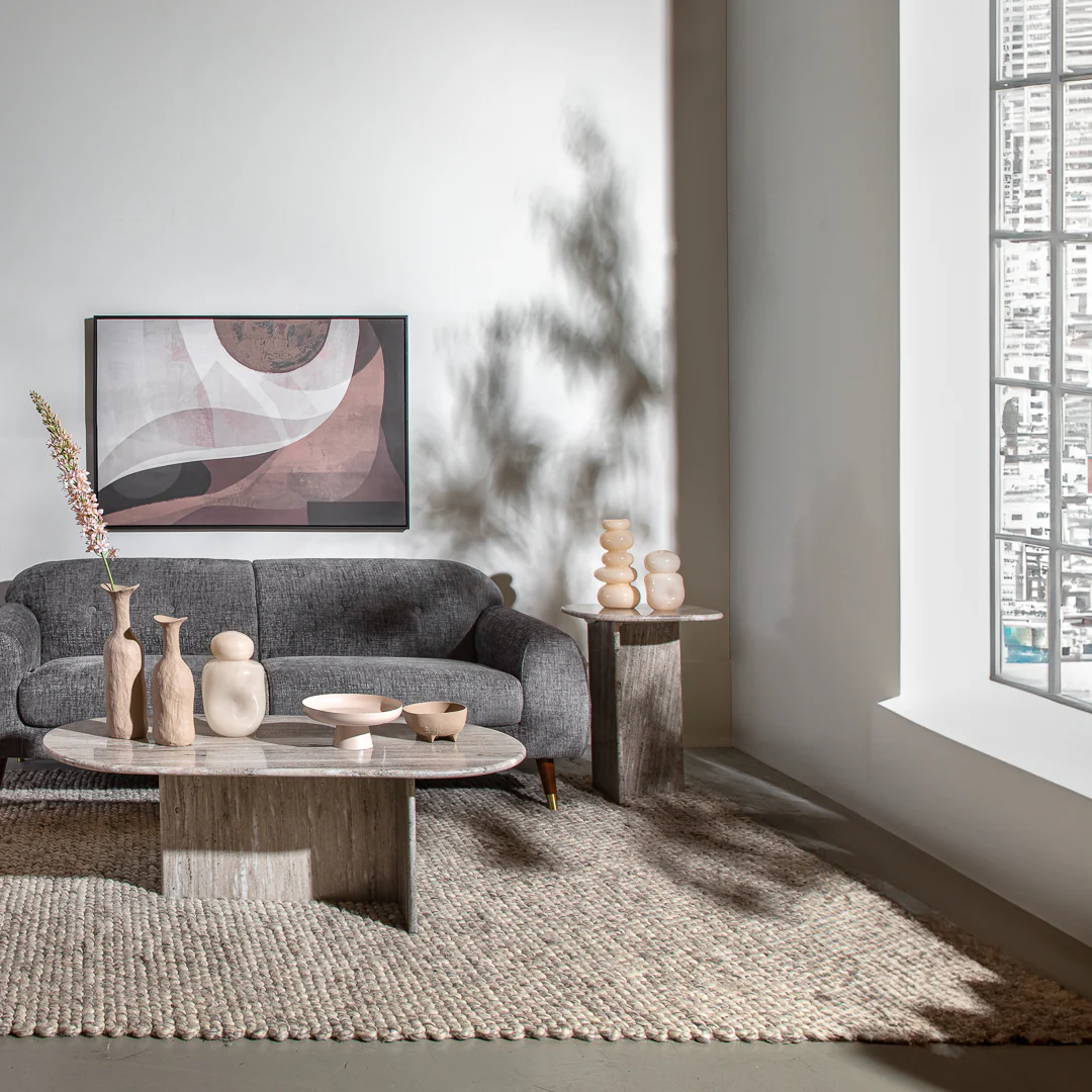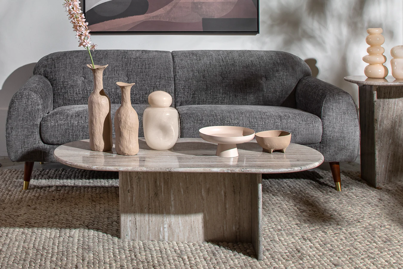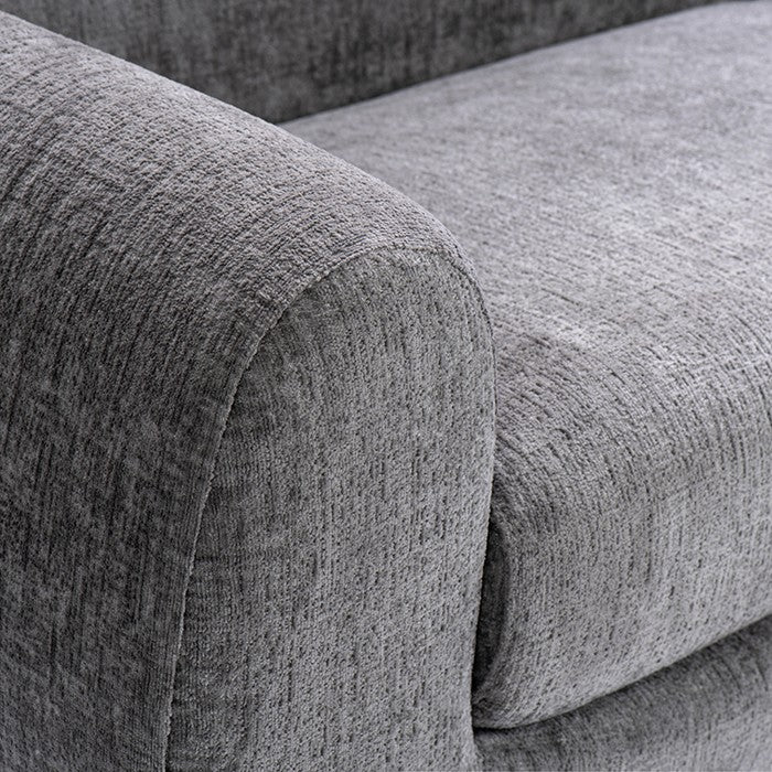 ספה ברטה מפנקת בצבע אפור. ספת סלון דו מושבית, בגימור עגול וקימורים רכים הנישאת על רגלי עץ זוויתיות.