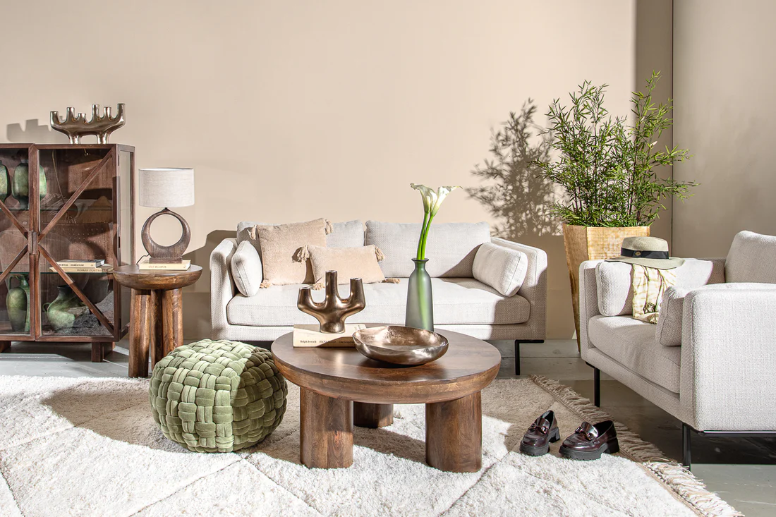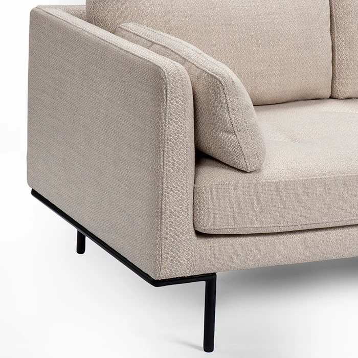 ספה לונה תלת מושבית במראה אורבני. ספה בקו מינימליסטי בגוון בז', עשוייה בד עמיד ונישאת על רגליי מתכת זוויתיות.
