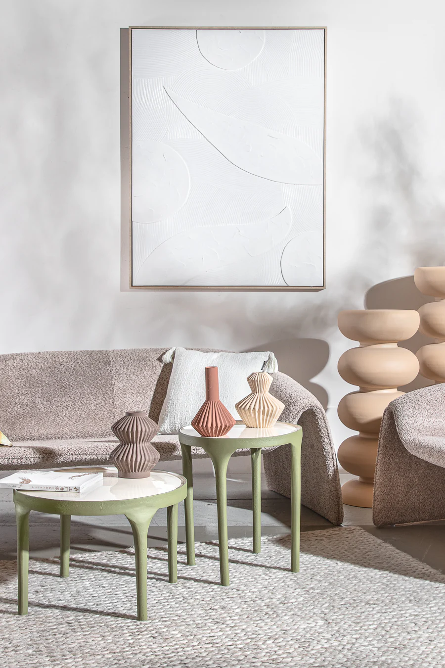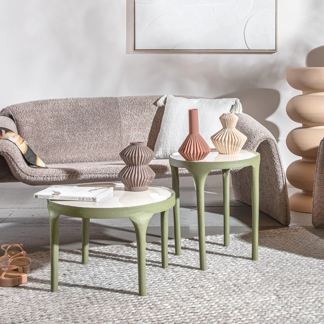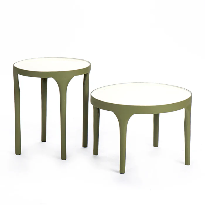 שולחן מתכת אייקון פרופיל עגול בירוק ו-בז'. רהיט בעיצוב ייחודי בעיצוב אורבני. שולחן חובה לאוהבי רהיטים בגוון דואל