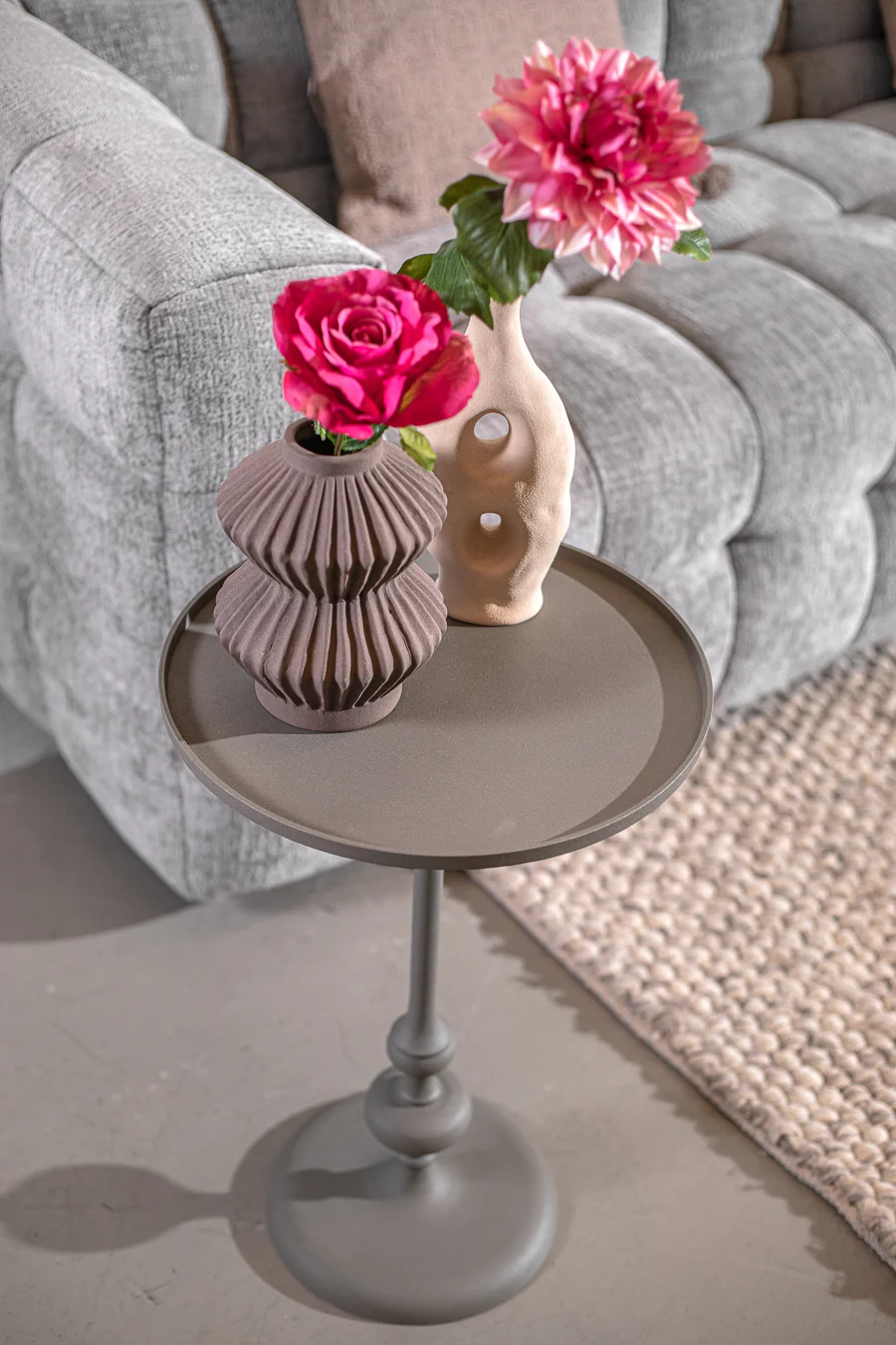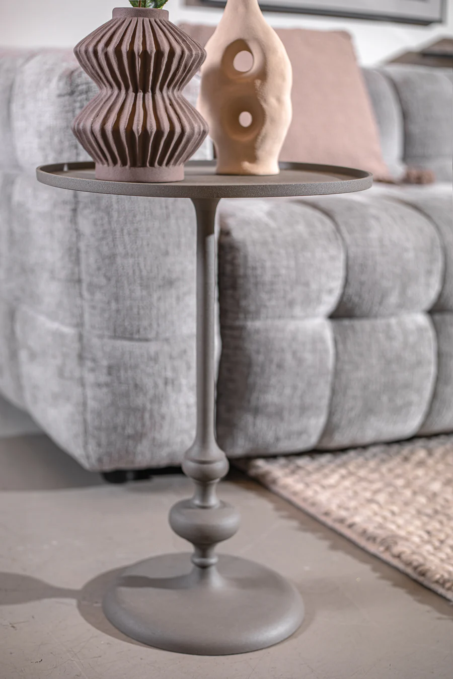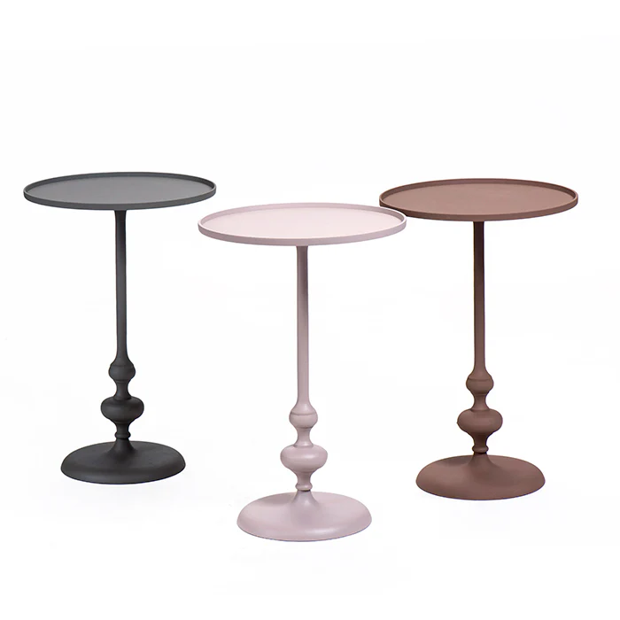 שולחן דקו סקיני בגוון ירוק. שולחן צד מעוצב פלטה עגולה הנישאת על רגל ברוחב משתנה. רהיט המתאים כשולחן קפה, שידת לילה או כמעמד לעציץ. שולחן צד מושלם ב-קו פיוטי.
