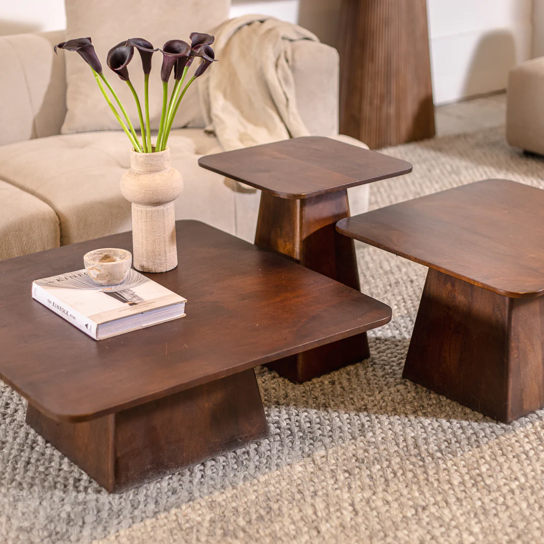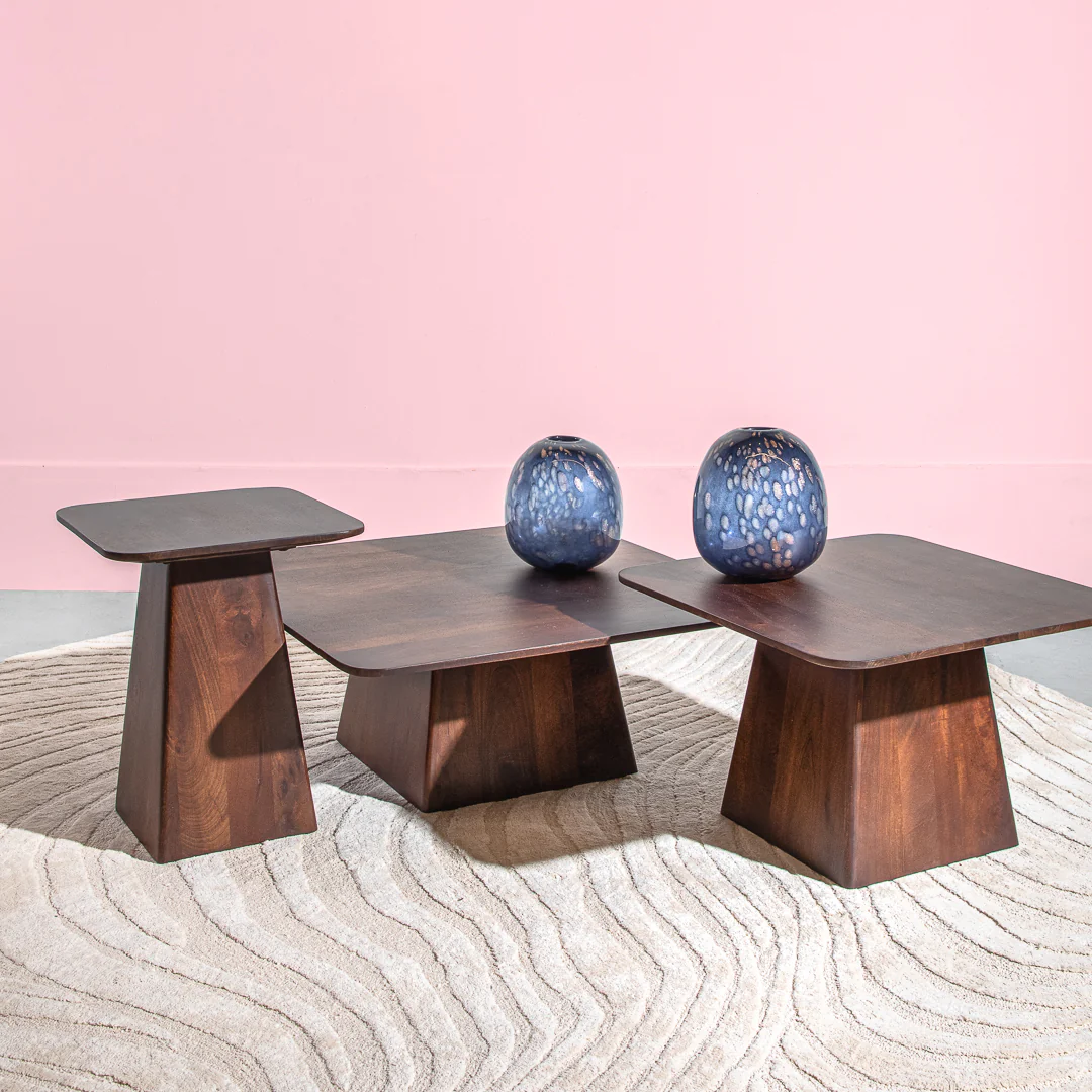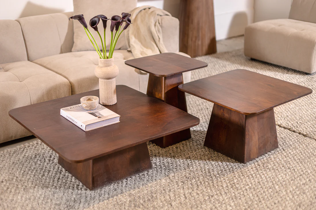 שולחן עץ מנגו ליבינג פרופיל ריבועי. רהיט ייחודי המעוצב פלטה עגולה שטוחה הנישאת על רגל עץ עבה. שולחן אירוח טרנדי לאוהבי הסגנון האותנטי