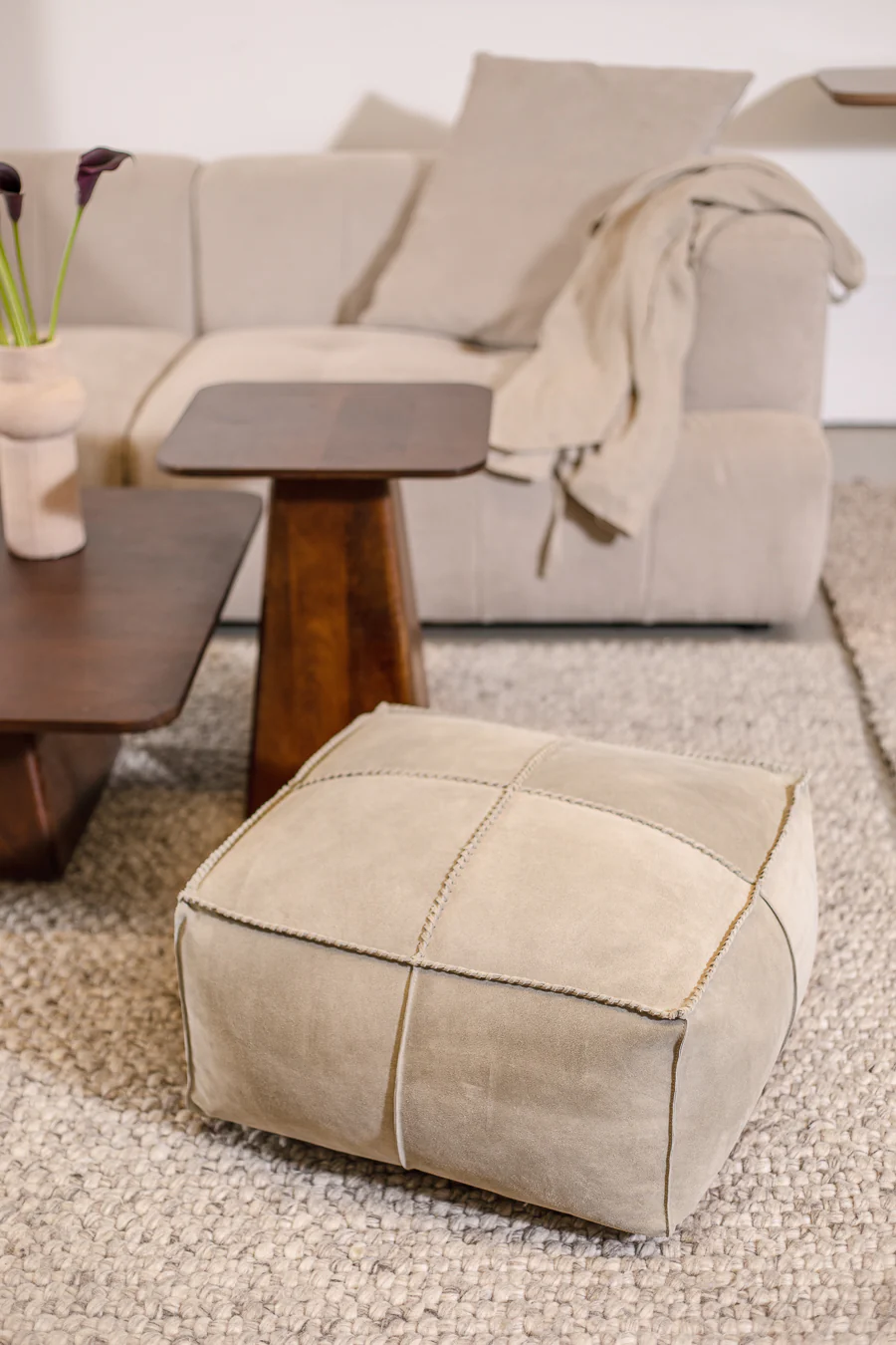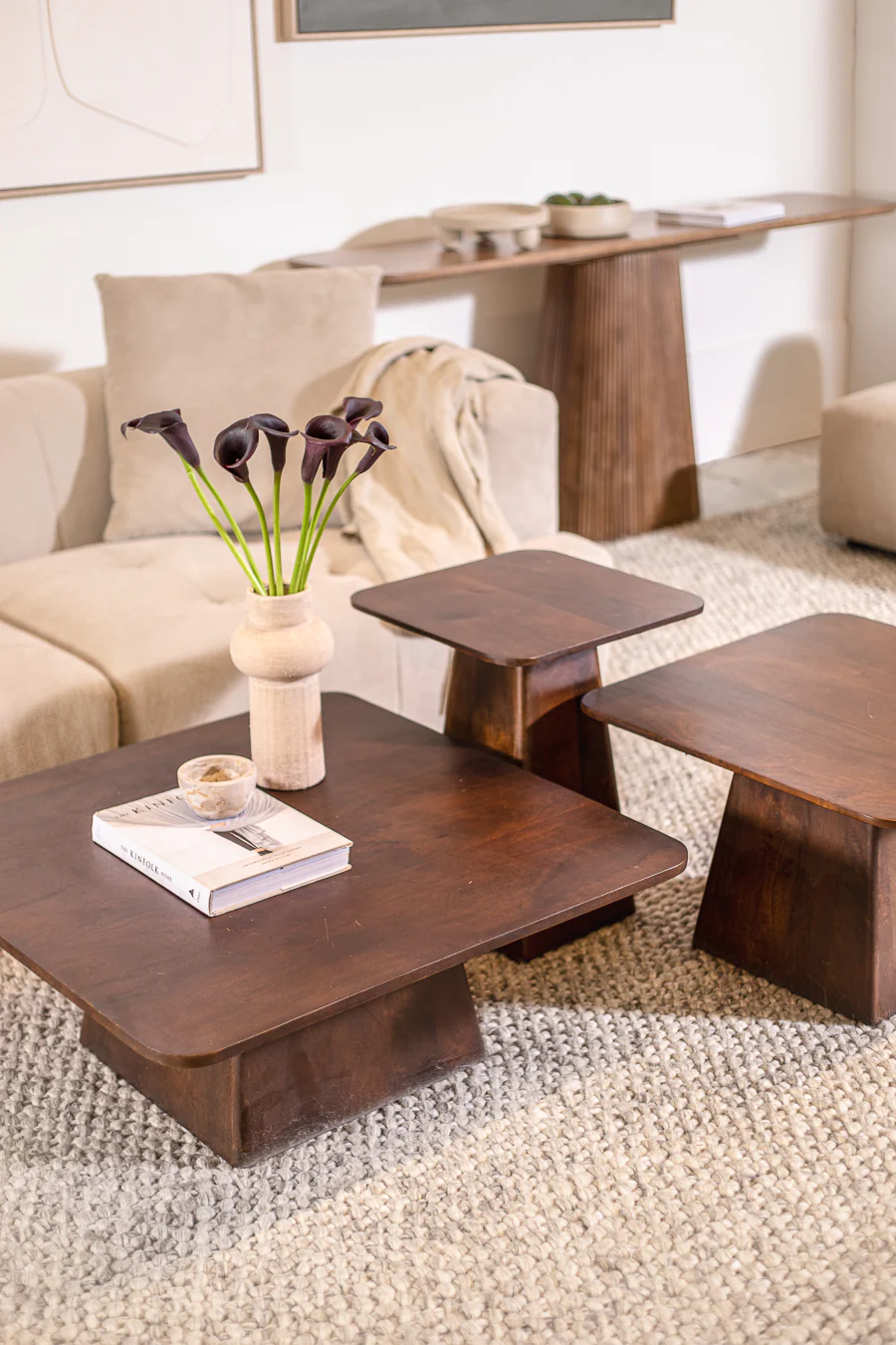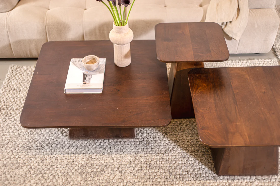 שולחן עץ מנגו ליבינג פרופיל ריבועי. רהיט ייחודי המעוצב פלטה עגולה שטוחה הנישאת על רגל עץ עבה. שולחן אירוח טרנדי לאוהבי הסגנון האותנטי