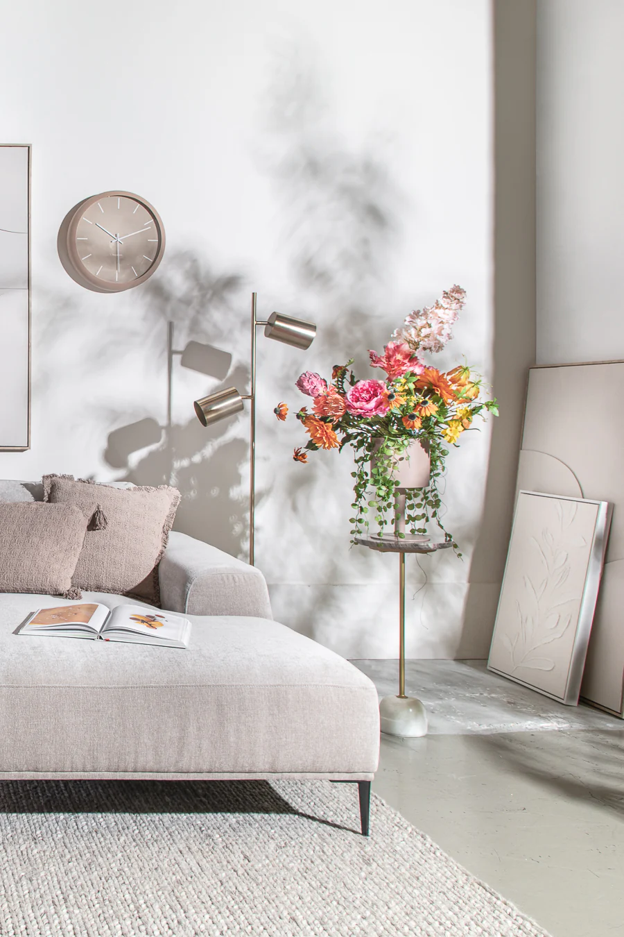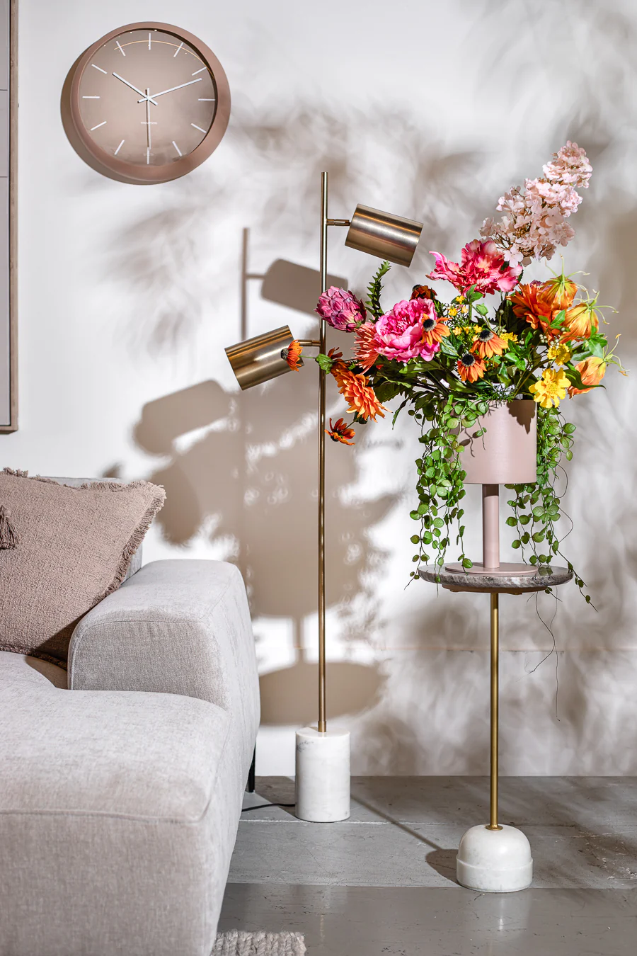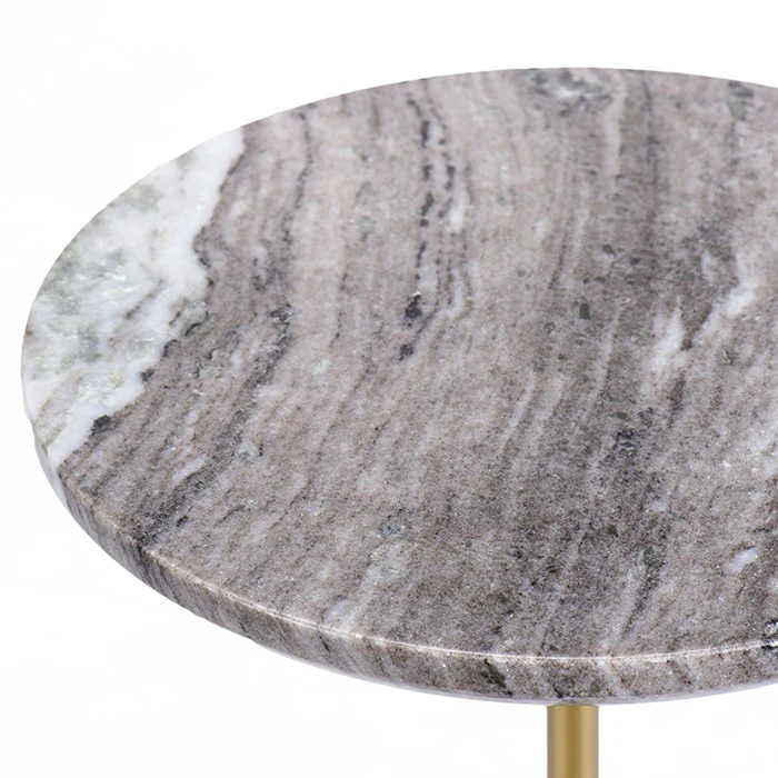שולחן שיש אדישן עגול בגוון גרדיאנט שחור- לבן. שולחן מעוצב פלטת שיש עגולה הנישאת על עמוד מוזהב דק ובסיס שיש עגול. שולחן צד מרהיב ב-קו סקיני ייחודי