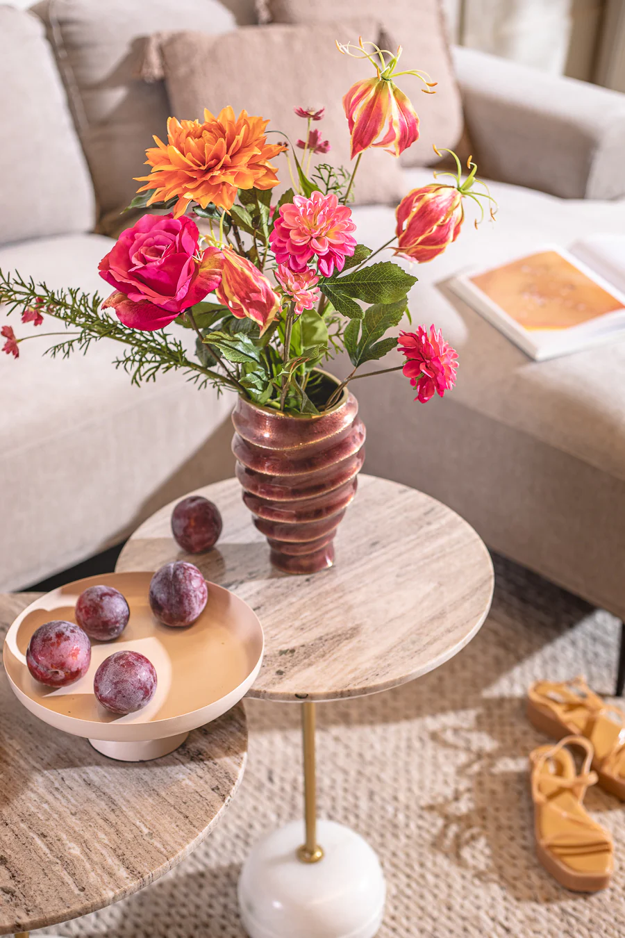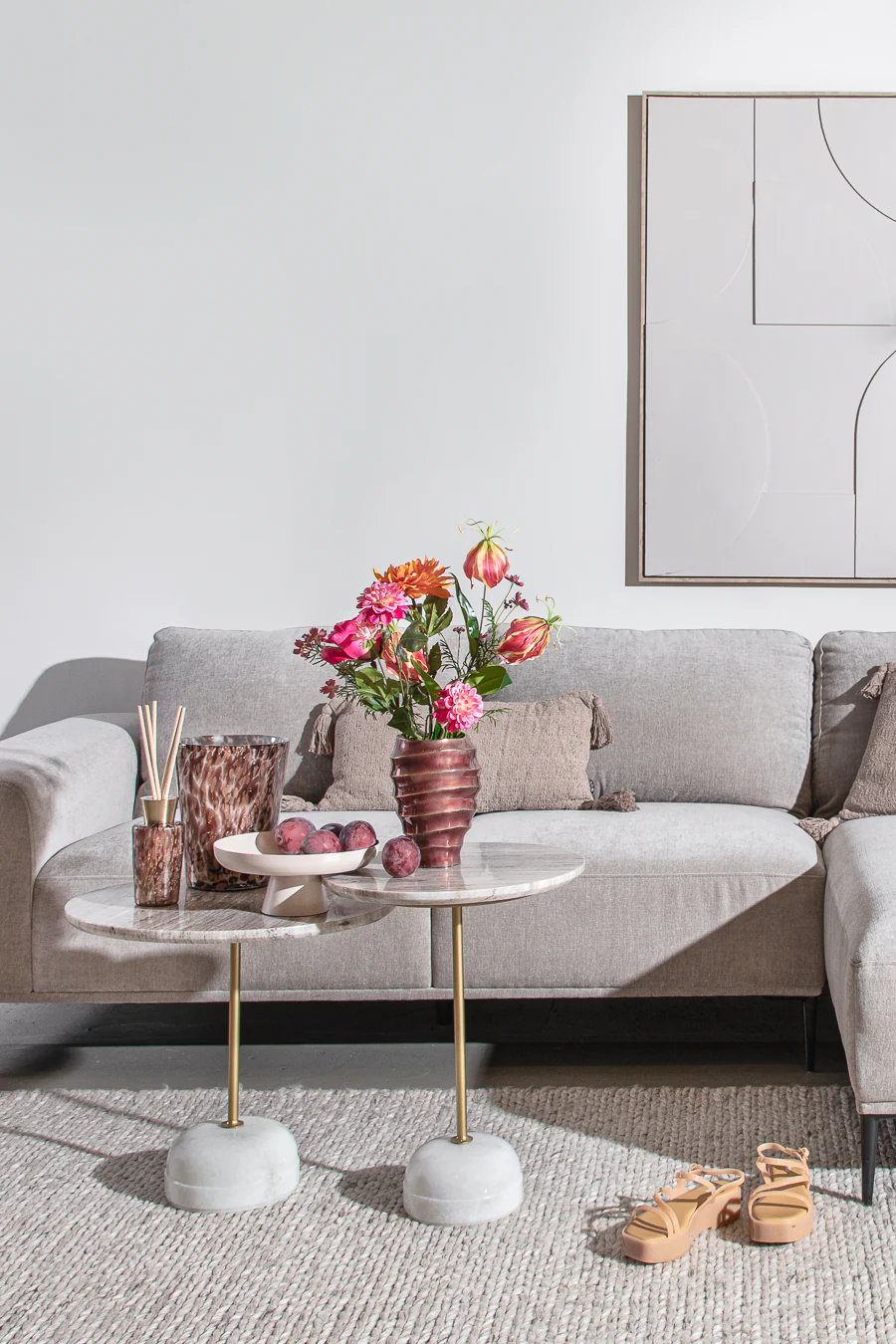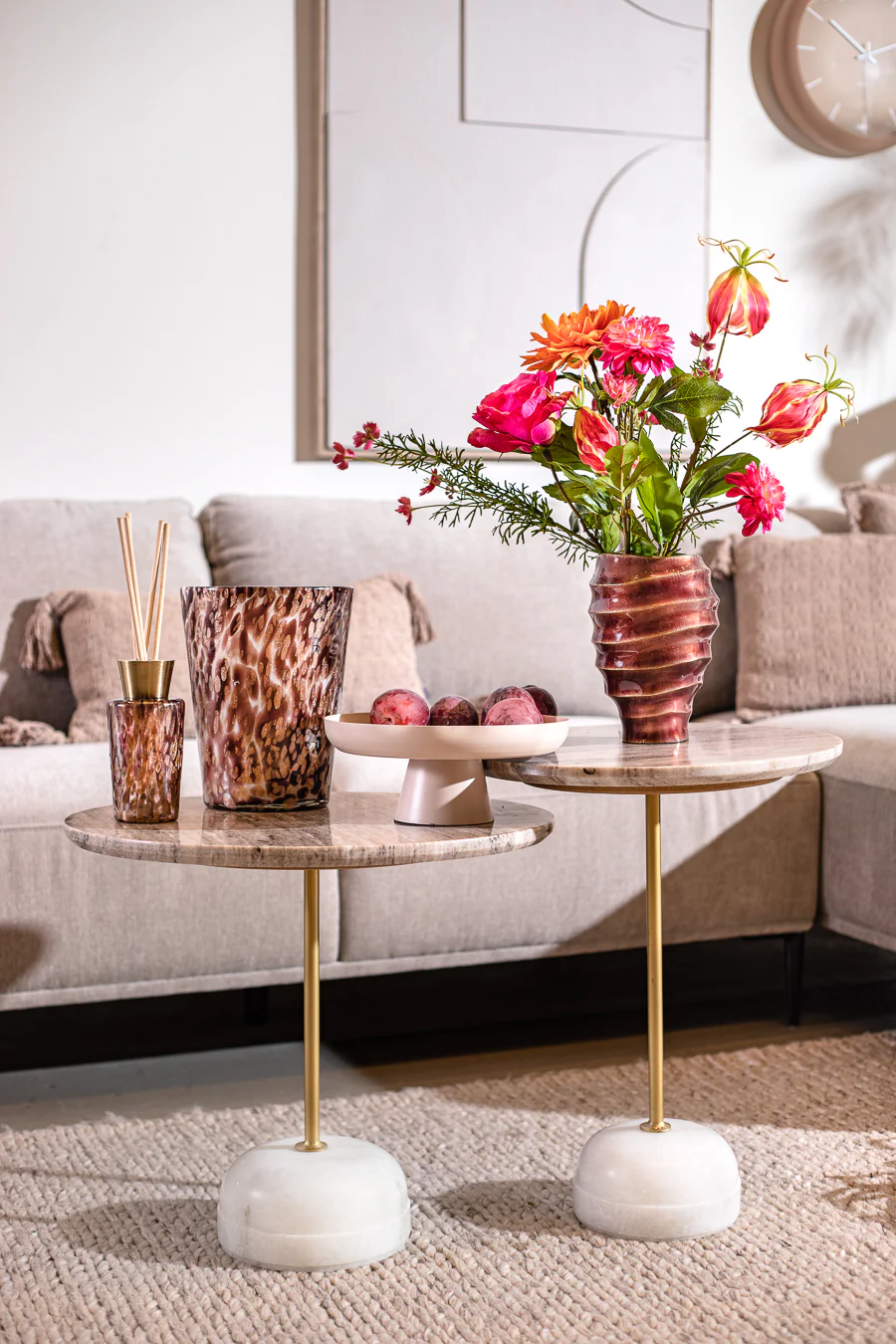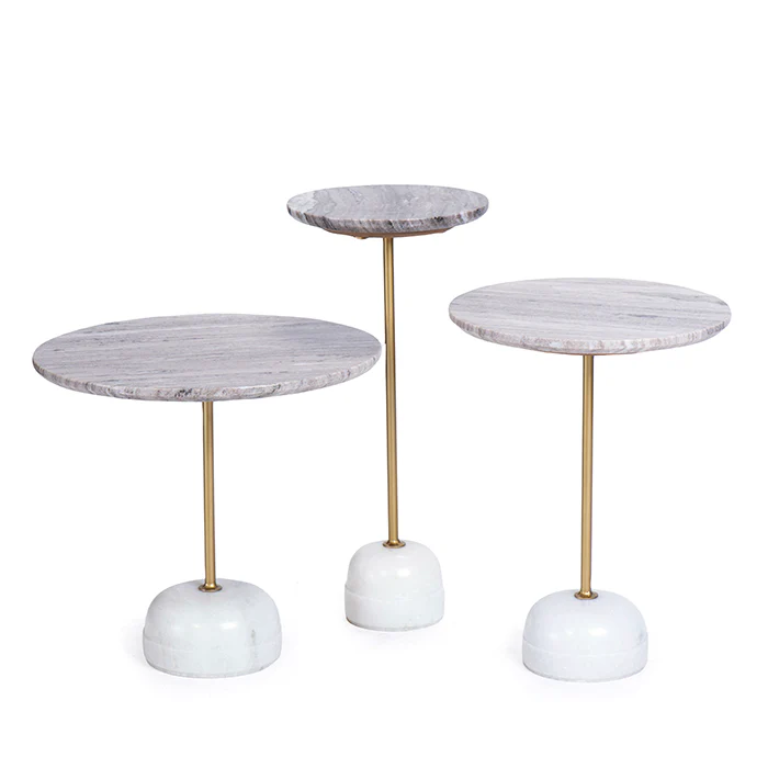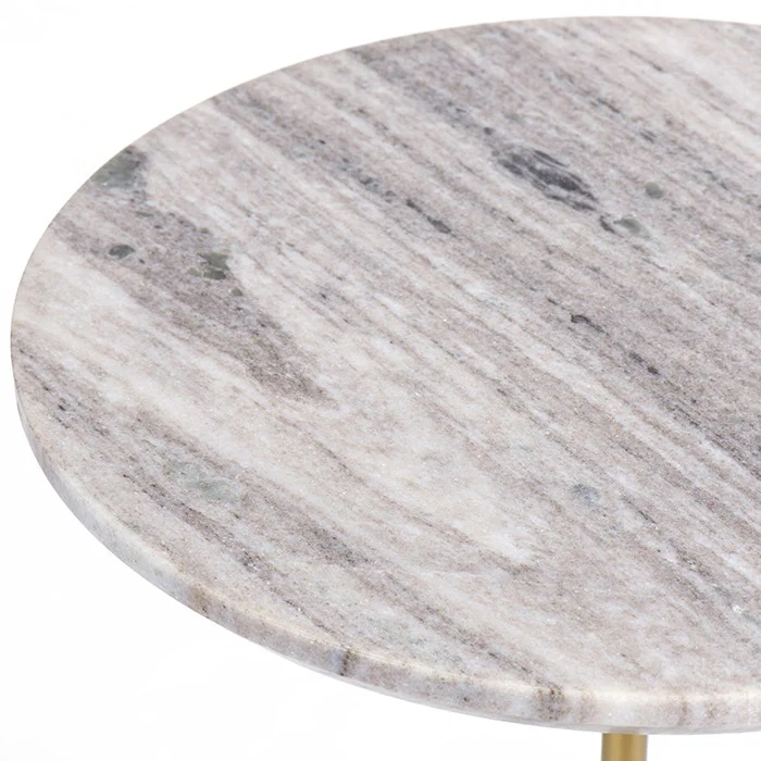 שולחן שיש אדישן עגול בגוון גרדיאנט שחור- לבן. שולחן מעוצב פלטת שיש עגולה הנישאת על עמוד מוזהב דק ובסיס שיש עגול. שולחן צד מרהיב ב-קו סקיני ייחודי.