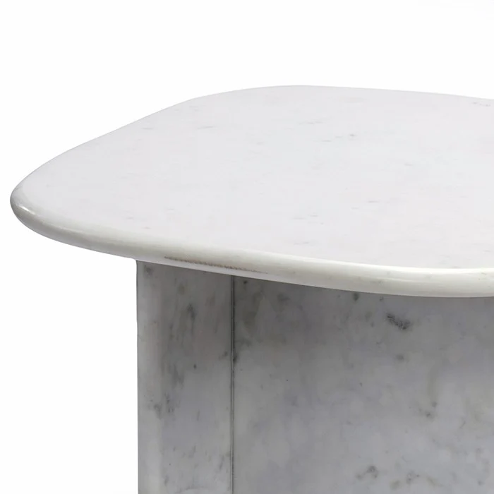 שולחן צד סוהו שיש אובאלי לבן הנישא על פרופיל שיש אנכי תואם. רהיט בקו קלאסי ונגיעת יוקרה. שולחן ייחודי לחללי מגורים המסוגננים בקו אלגנט קונטרסט