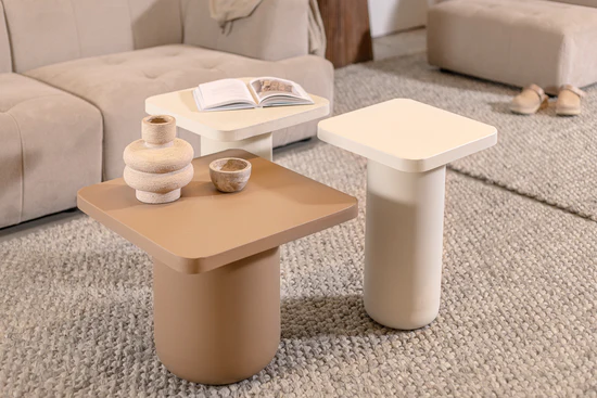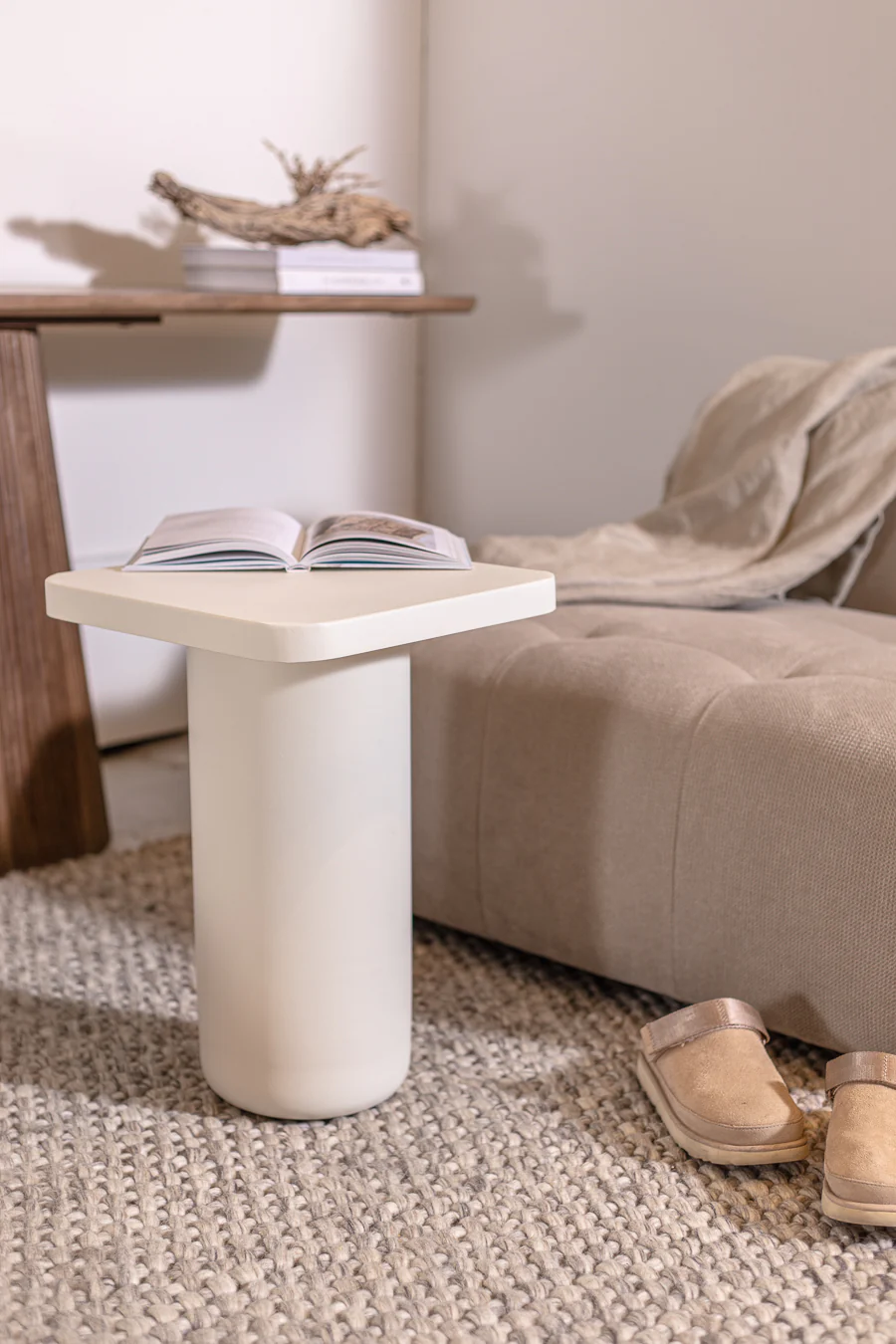 שולחן מטאל ספייס גיאומטרי בגוון בהיר. שולחן מתכת מעוצב פלטה ריבועית, הניצבת על עמוד עגול עבה. שולחן אירוח מעוצב במרקם ייחודי.