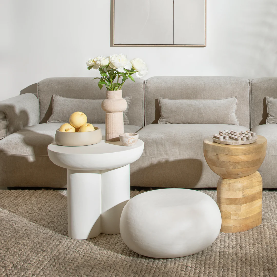 שולחן צד ספייס בצבע אייבורי. שולחן אירוח המעוצב פלטה עגולה עבה, הנישאת על שלישיית רגלי אלפנט קצרות.