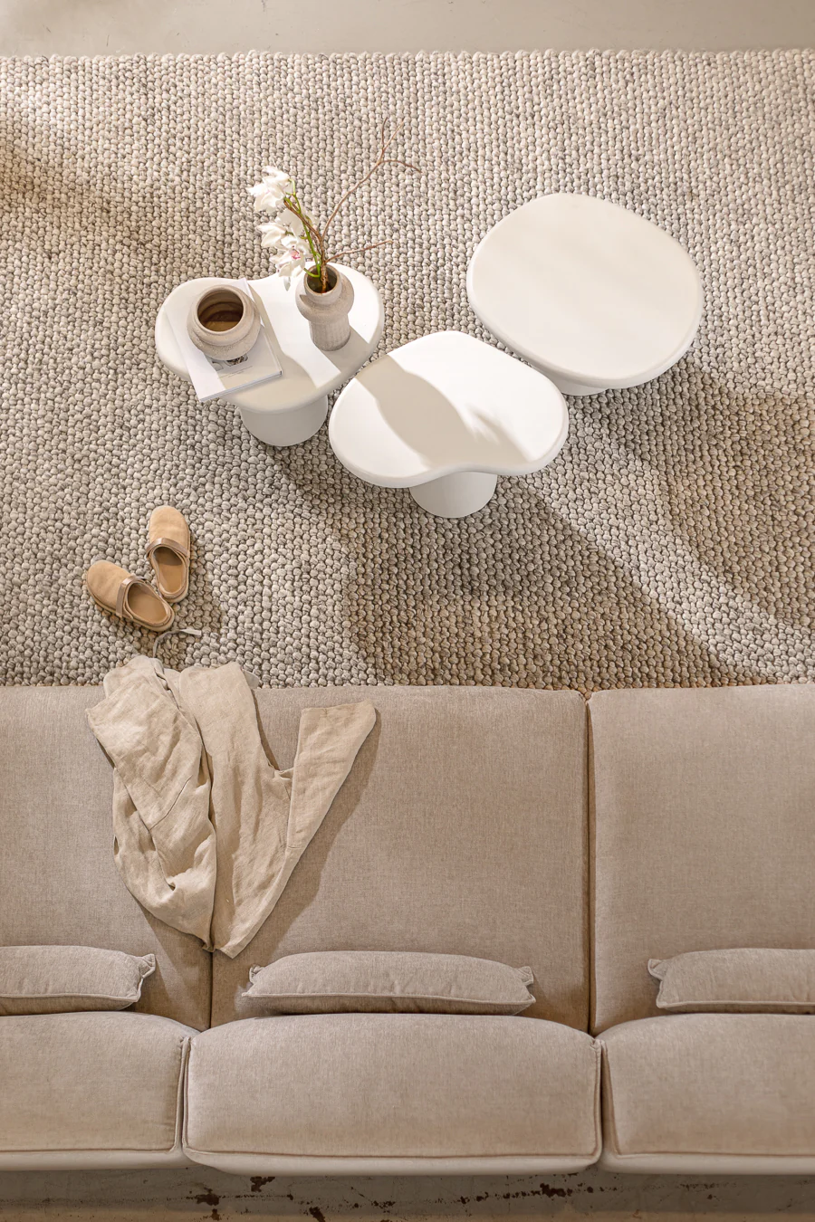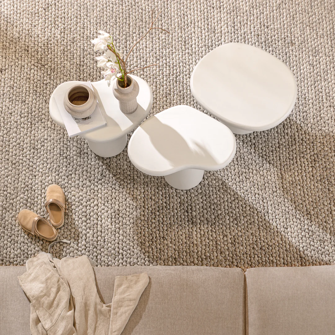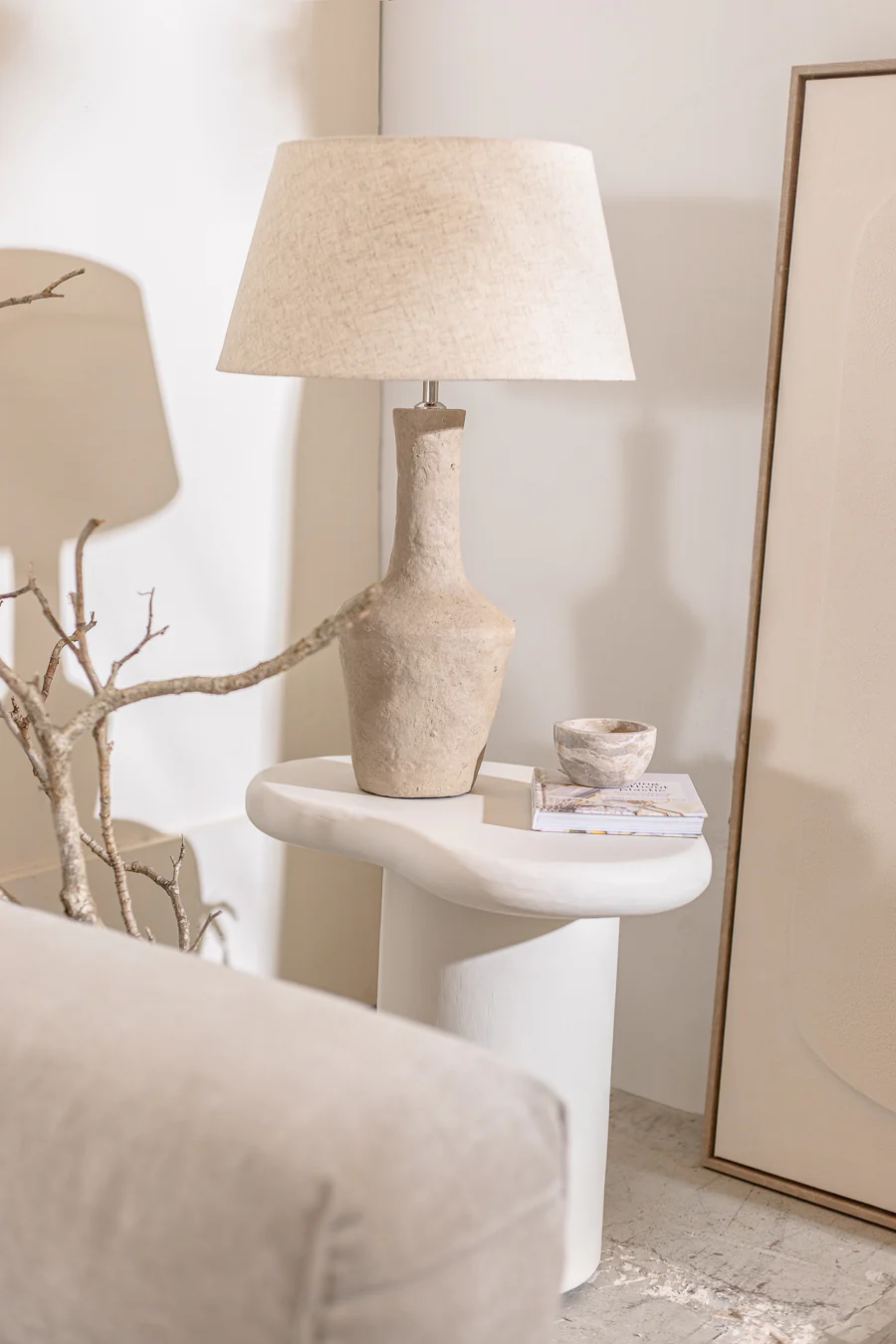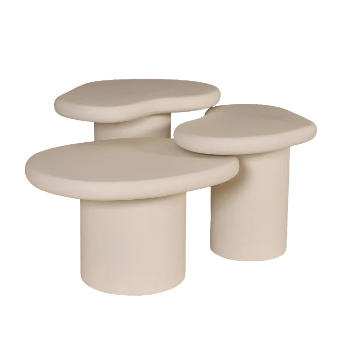 שולחן אירוח ספייס בצבע אייבורי. שולחן קפה מעוצב פלטה אמורפית וגליל רגל עבה בגימור אבן גיר.