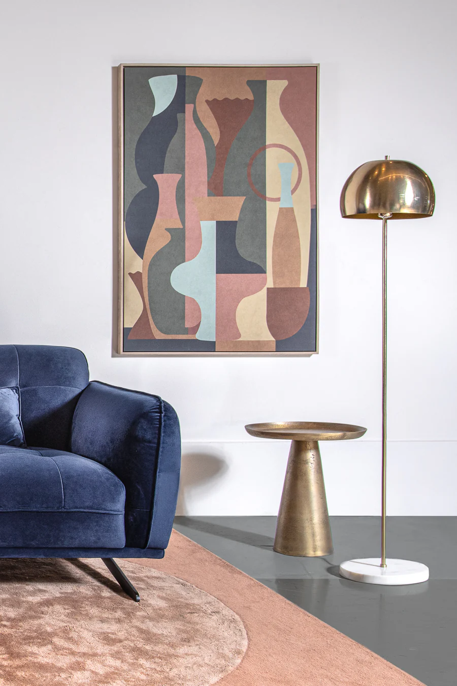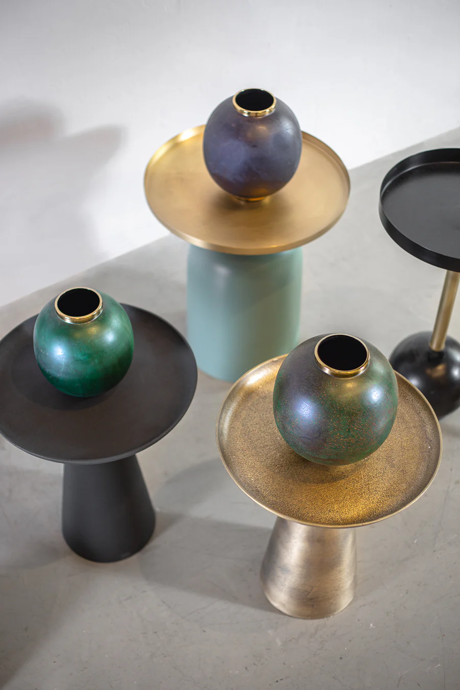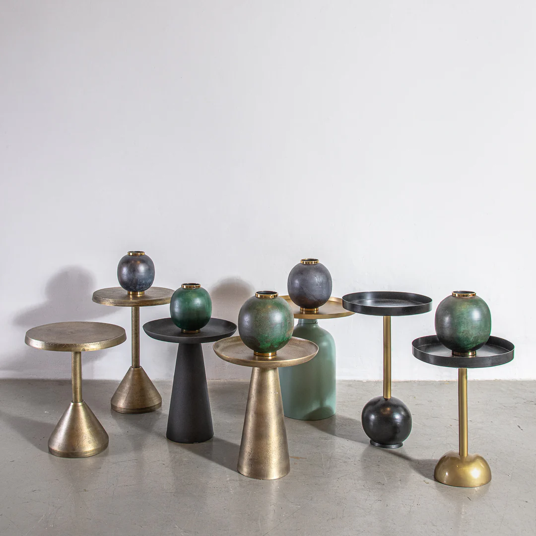 שולחן פריים מתכתי בקו תעשייתי טרנדי בצבע מוזהב. פריט אירוח ייחודי המעצב פלטה עגולה שטוחה הנישאת על רגל עץ עבה בפרופיל צר. שולחן אירוח טרנדי לאוהבי הסגנון האדג'י