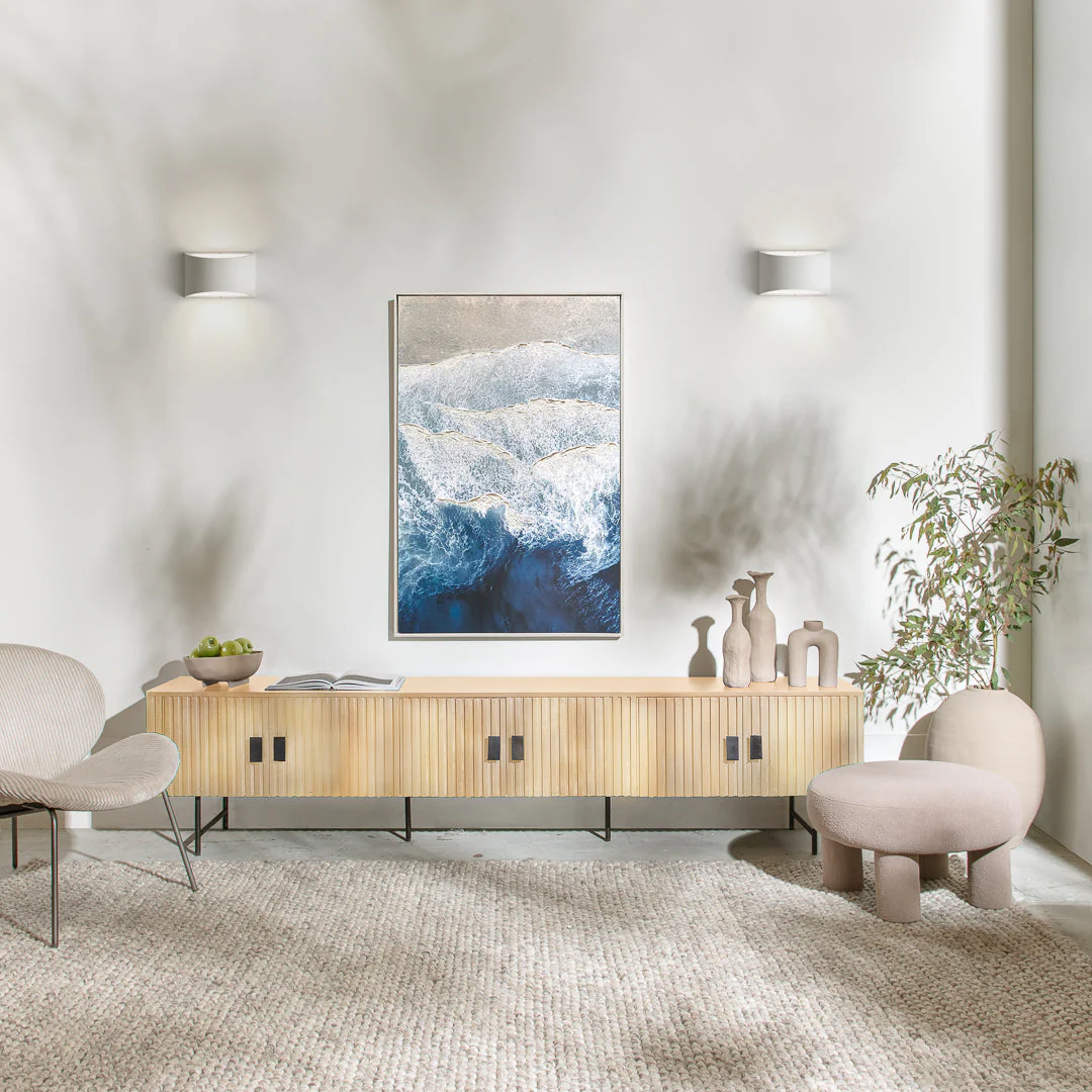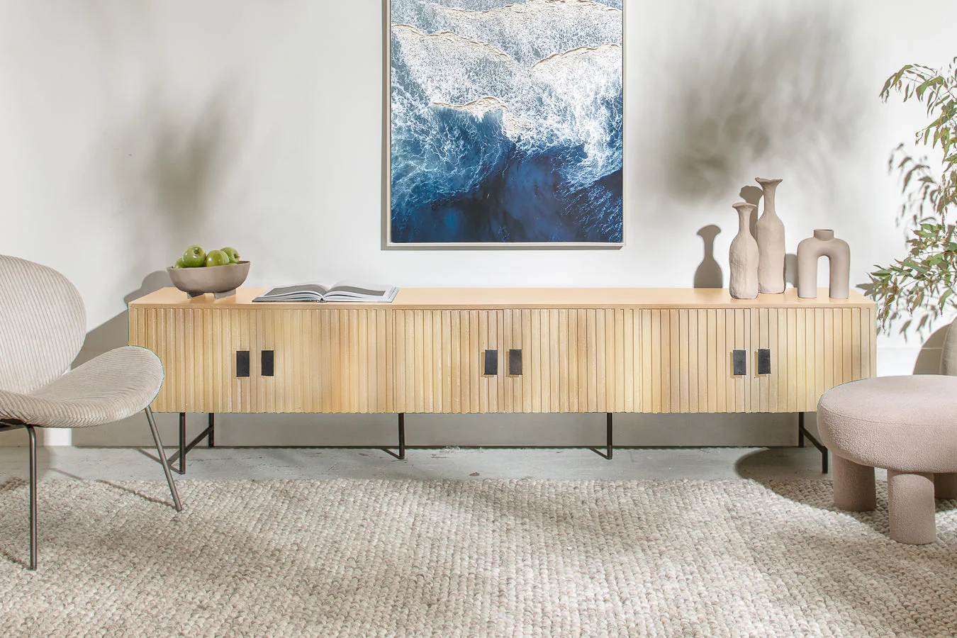 שידת מדיה מרגו בגוון עץ נטורל. שידת עץ מנגו, מחולקת ל 3 יחידות איחסון הנסגרות בדלתות בדיגום פסי עץ ייחודי. שידה ייחודית לשילוב בחלל מגורים בסגנון עכשווי.