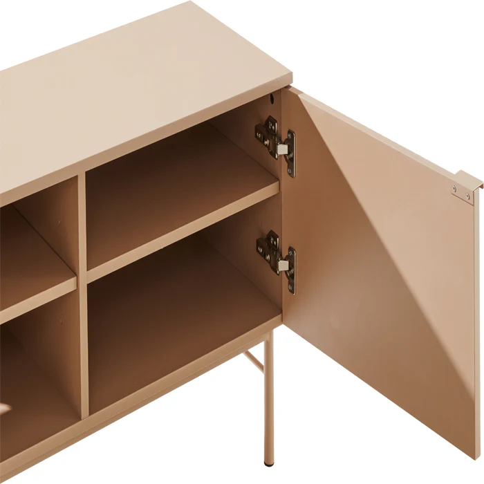 שידת מדיה סאגה בצבע חום. יחידת איחסון רוחבית המורכבת מ-2 דלתות פתיחה במרקם פסי עץ וחלל פנימי ממודף. השידה נישא על שלדת מתכת בגוון זהה