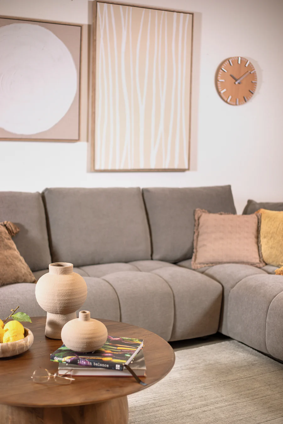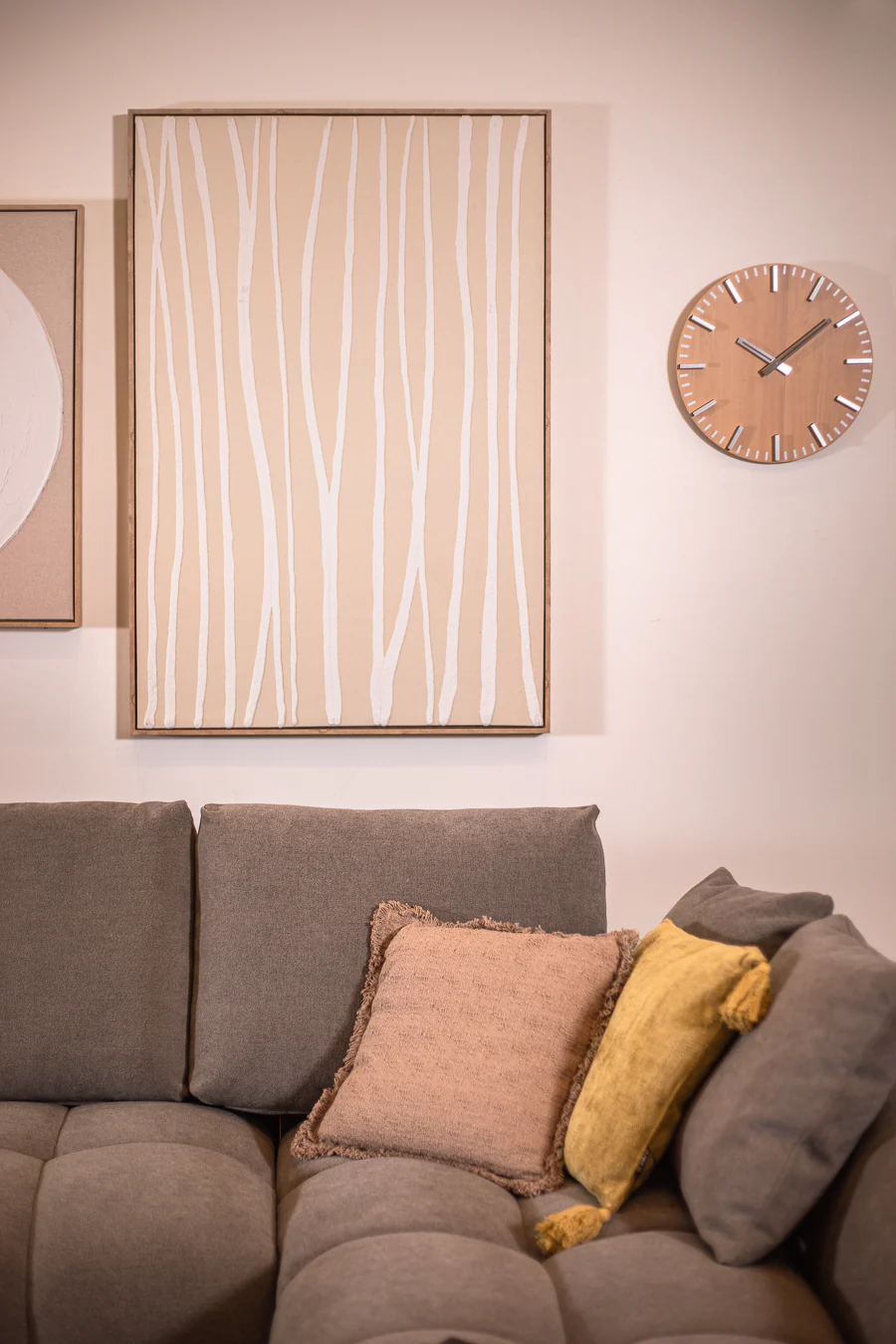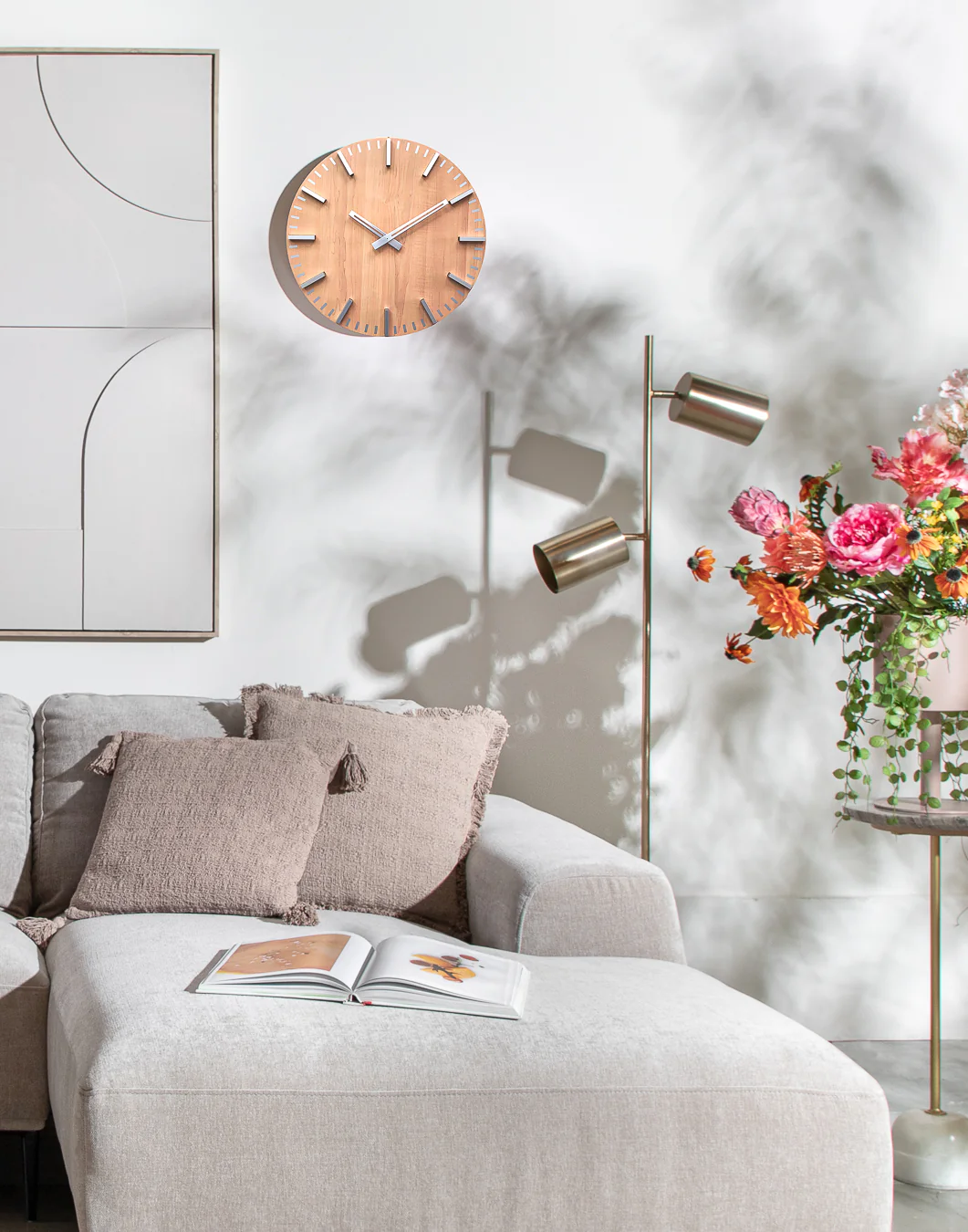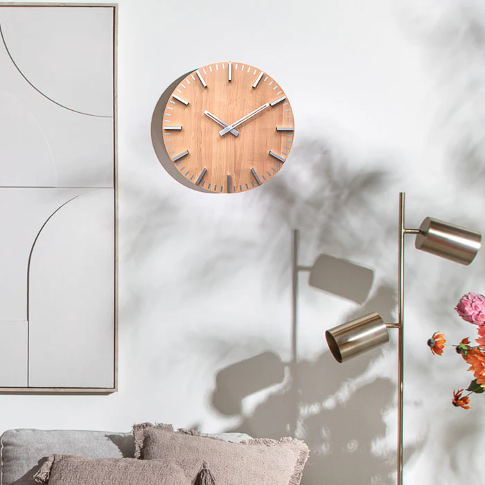 שעון קיר ספייס לייט ווד. שעון מתכת עגול בעיצוב מנימליסטי המורכב ספרות ומחוגים כסופים ורקע בדיגום עץ בהיר. שעון בעיצוב קלאס ייחודי.